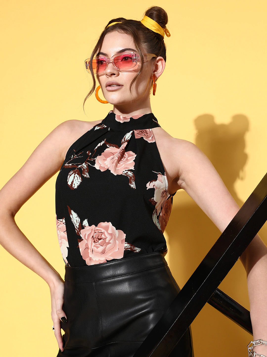 Liven up your capsule assortment with timeless style essence by adding to your cart this bewitching Black and Brown Floral Print High Neck Sleeveless Regular Length Top from the latest casual wear collection of Berrylush. Showcasing high-neck design that lends your neckline a smart appeal with a touch of sophistication. Rendered from the finest polyester material to offer your skin the utmost breathability with unrestricted airflow. In addition, the elegantly outshines your natural figure with a flattering silhouette. Let your fabulous look turn heads by partnering this top with a black mini skirt, block heels, circle hoop earrings, and a trendy side bag.