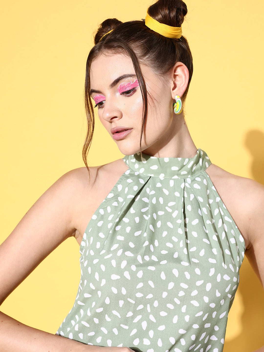 Lend your casual essentials a modern and contemporary twist by opting for this glamorous Green and White Geometric Print High Neck Sleeveless Regular Length Top introduced by Berrylush. Accentuated with a charming amalgam of green and white geometric print that gives this top an eye-catching design followed by a ritzy vibe. The regular styling makes this top appear modest and a perfect option for any casual event. Also, the high-neck design lends your shoulders an alluring exposure with a smart appearance to your neckline. Create a fabulous look by wearing this top with denim jeans, a pair of white high-heels, green earrings, and a chic handbag.