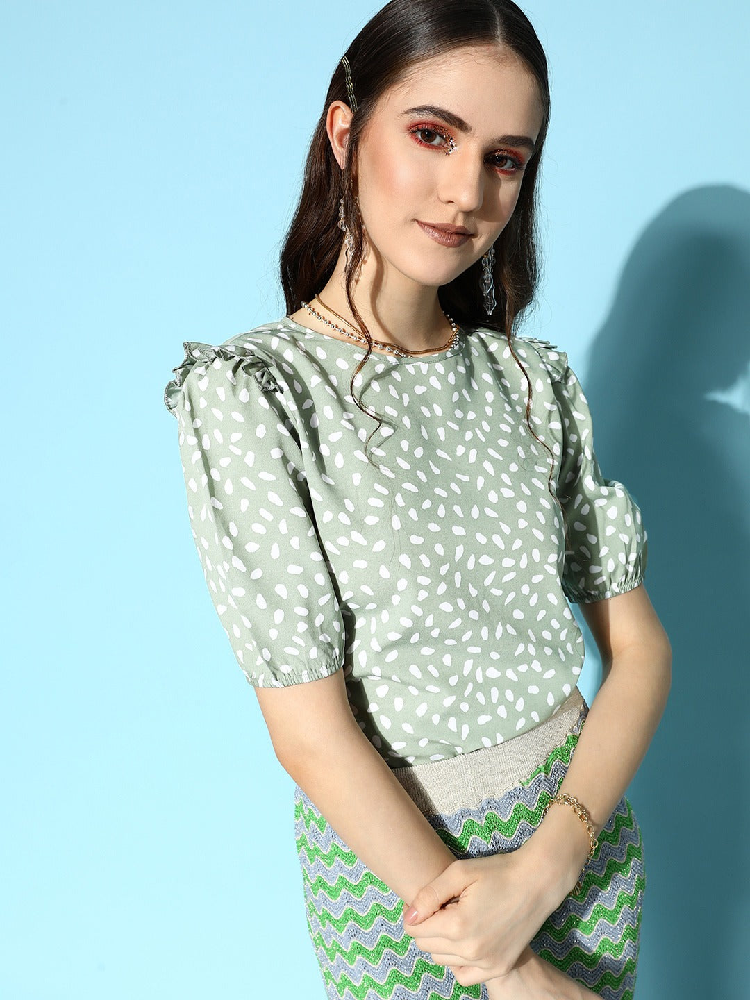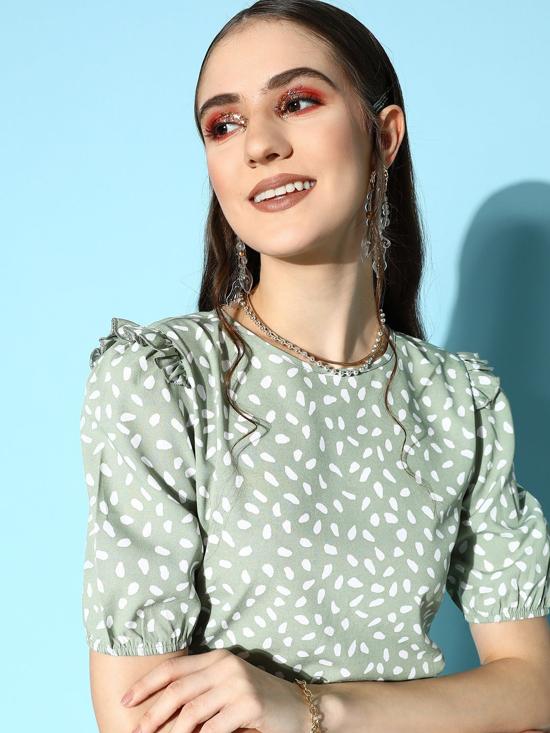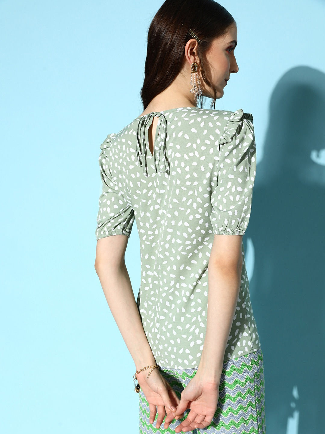 Flaunt your sophisticated yet playful personality with your breezy casual look by donning this gorgeous Berrylush Women Green & White Animal Printed Round Neck Tie-Up Back Ruffled Crepe Crop Top from Berrylush. Styled with short-puff sleeves to lend this top an edgy and trendy fashion accent with convenient exposure to your beautiful arms. Prepared from the finest crepe polyester fabric to provide anti-wrinkle and quick-drying features to this top for a smart appearance. Moreover, a regular fit of this top offers a comfortable silhouette with a refined look. Step out looking chic by wearing this crop top with matching flare pants, a pair of classy sandals, cute hoop earrings, and a sassy clutch.