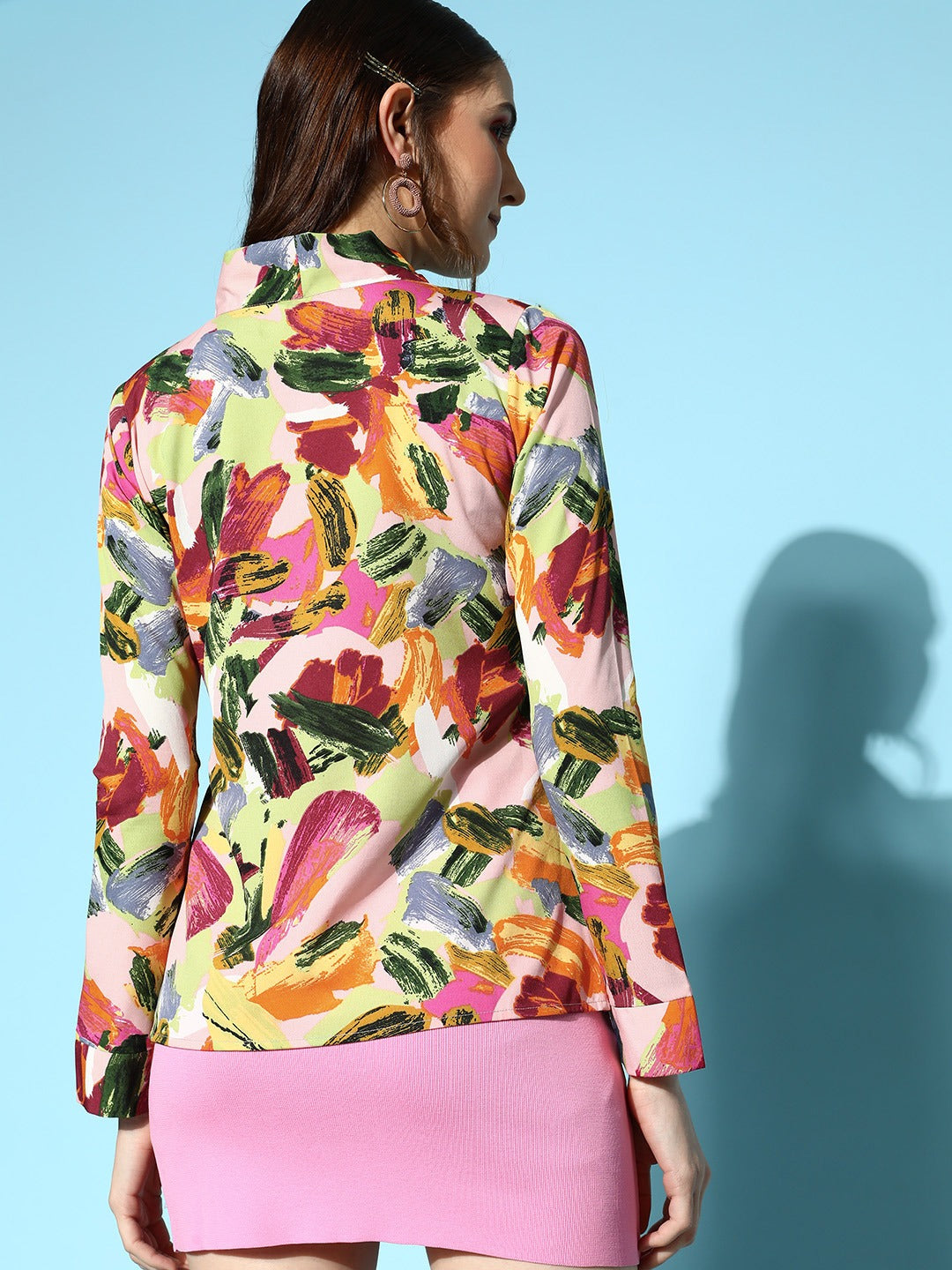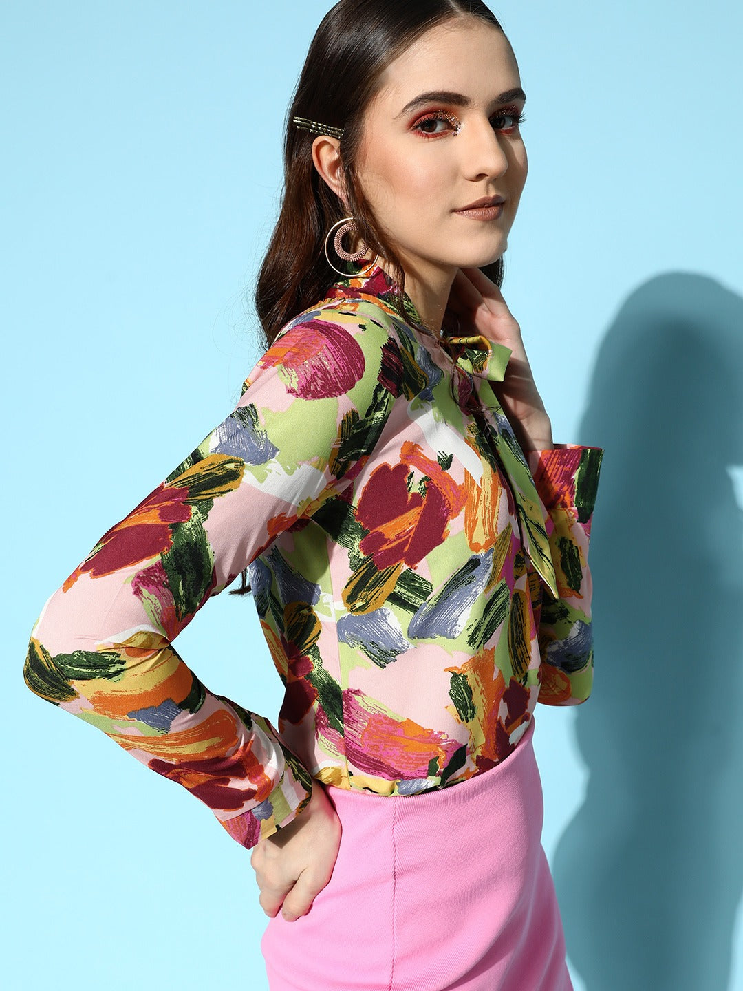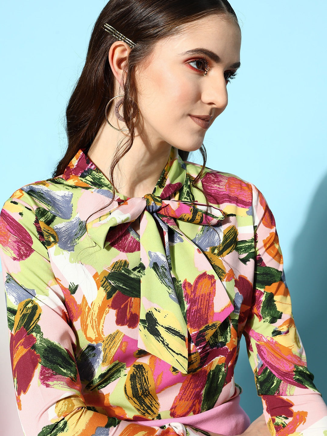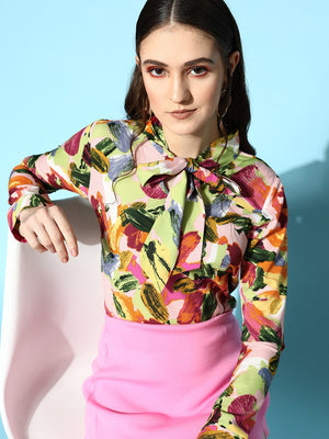 Berrylush Women Pink & Green Brushstroke Printed Tie-Up Neck Crepe Regular Top