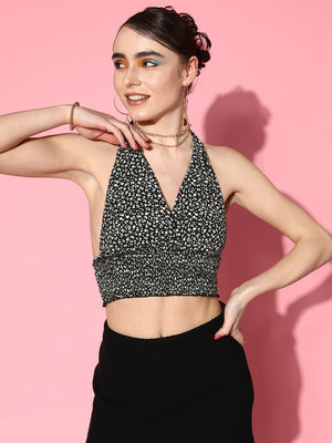 Berrylush Women Black & White Floral Printed Halter Neck Sleeveless Tie-Up Backless Smocked Crop Top