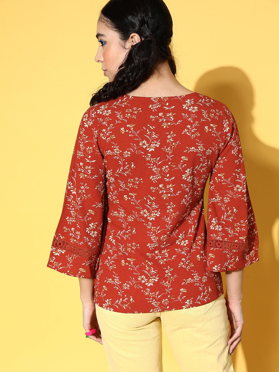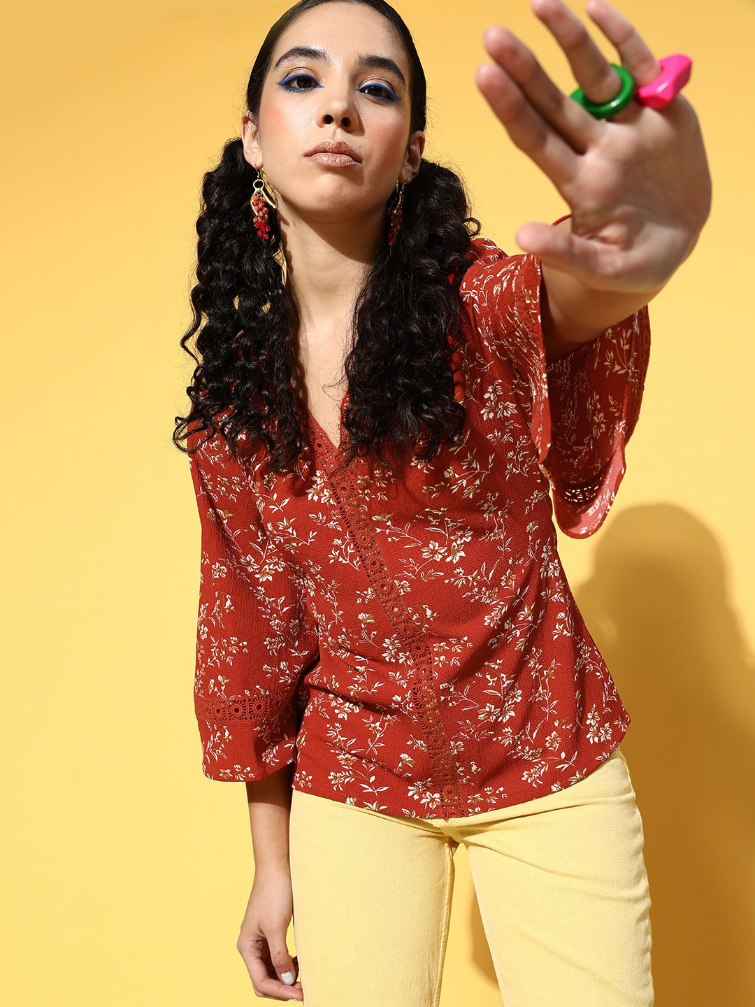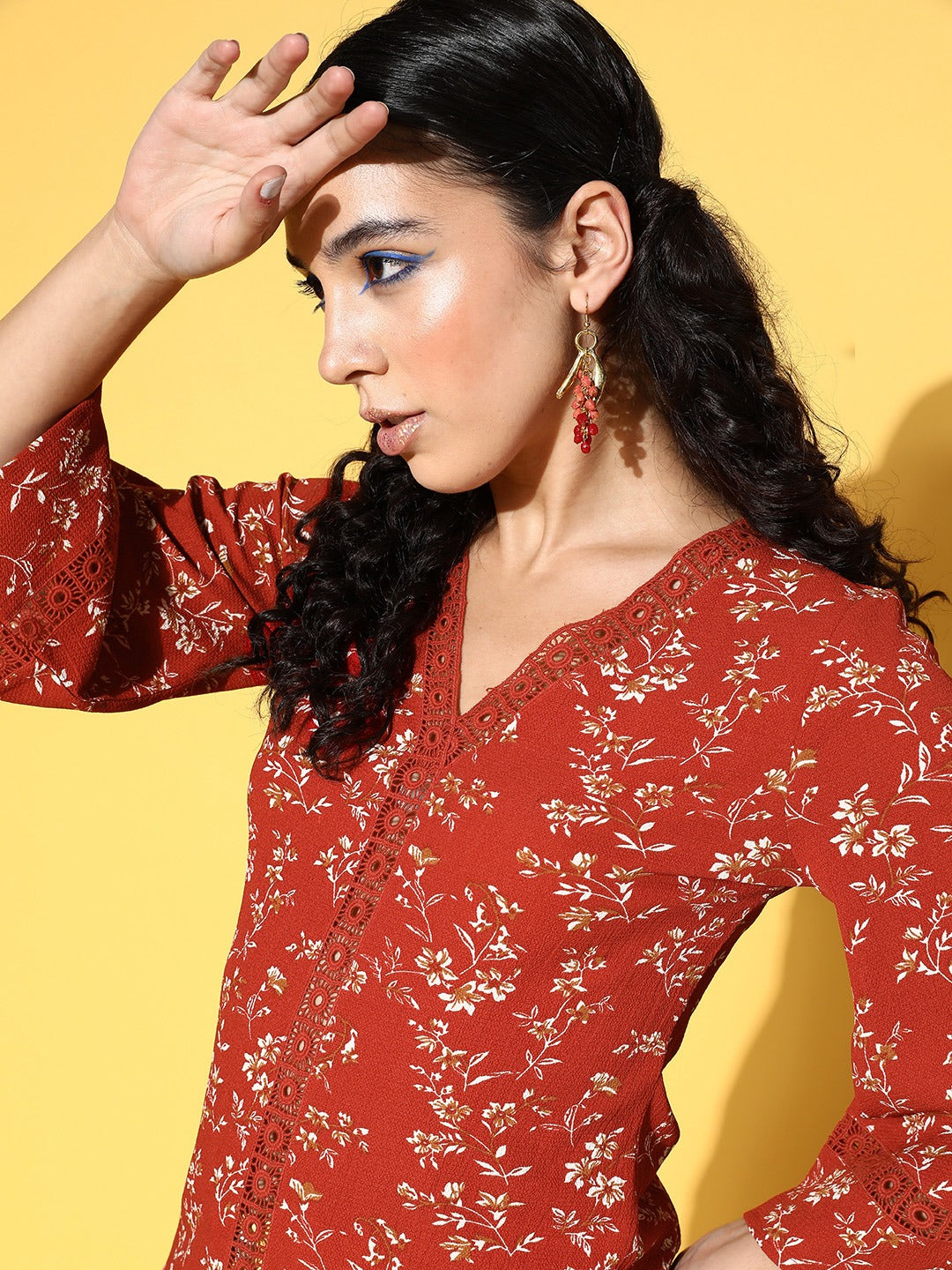Berrylush Women Red & Off-White Floral Printed V-Neck Three-Quarter Sleeve Laced Regular Top