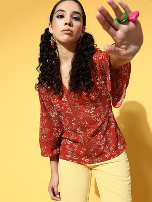 Exemplify your casual edit with some trendy and gorgeous style elements by opting for this ravishing Red and Off-White Floral Printed V-Neck Woven Regular Top designed by Berrylush. Sculpted with woven detailing that intensity the overall structural integrity of this top to support flexible body movements with utmost comfort. Prepared from high-quality polyester material that lends this top lightweight and limitless breathability. Also, the regular length gives this top a practical design that offers you an elegant and graceful appearance. Complete your casual look flawlessly by teaming this top with black jeans, block heels, pear tassel earrings, and a cute side bag.