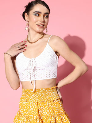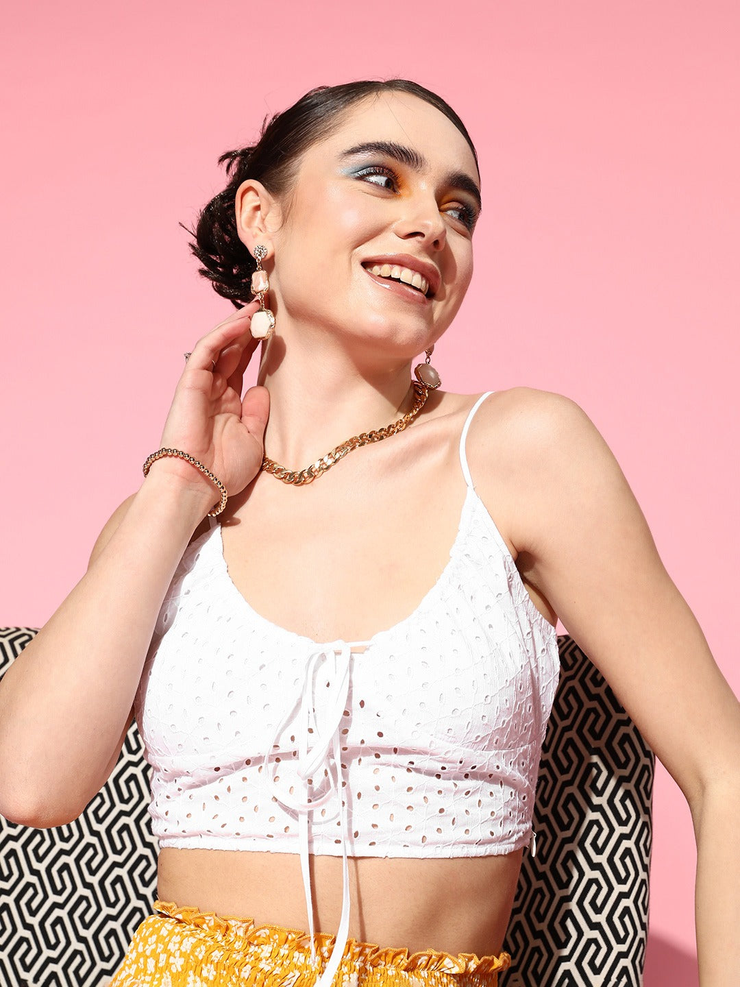 Berrylush Women Solid White Round Neck Sleeveless Front Tie-Up Schiffli Cropped Top