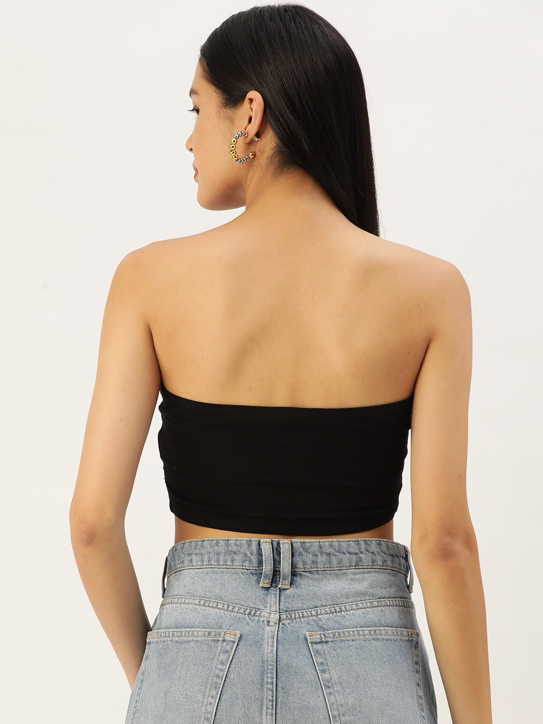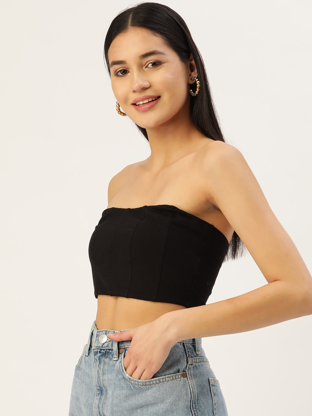 Intensify your capsule closet with neutral and basic statement pieces just like this stunning Solid Black Strapless Tube Crop Top introduced by Berrylush from its latest casual wear collection of Berrylush. Showcasing strapless neck design that gives a wider and more enticing view to your neckline, collarbones, and shoulders. The woven weave improves the structural strength and integrity of this top with seamless stitching. Also, the stretchable characteristic of this top offers size flexibility and elastic nature for a comfy feel. You can pair up this crop with a high-waist denim skirt, light denim jacket, white sneakers, golden hoop earrings, and a sassy side bag to create a fashion-focused look.