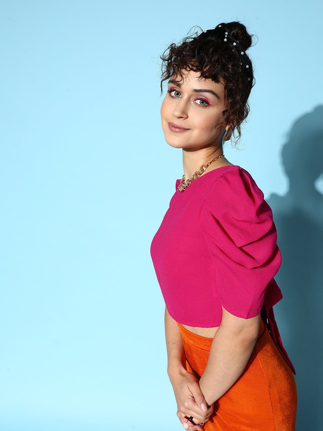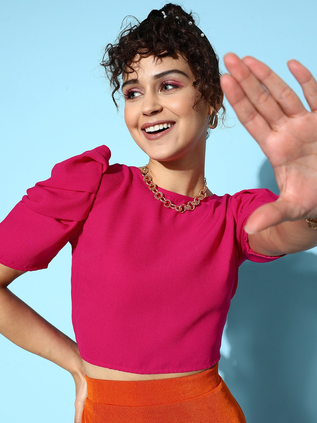 Berrylush Women Solid Pink Round Neck Puff Sleeves Crepe Styled Tie-Up Back Cropped Top