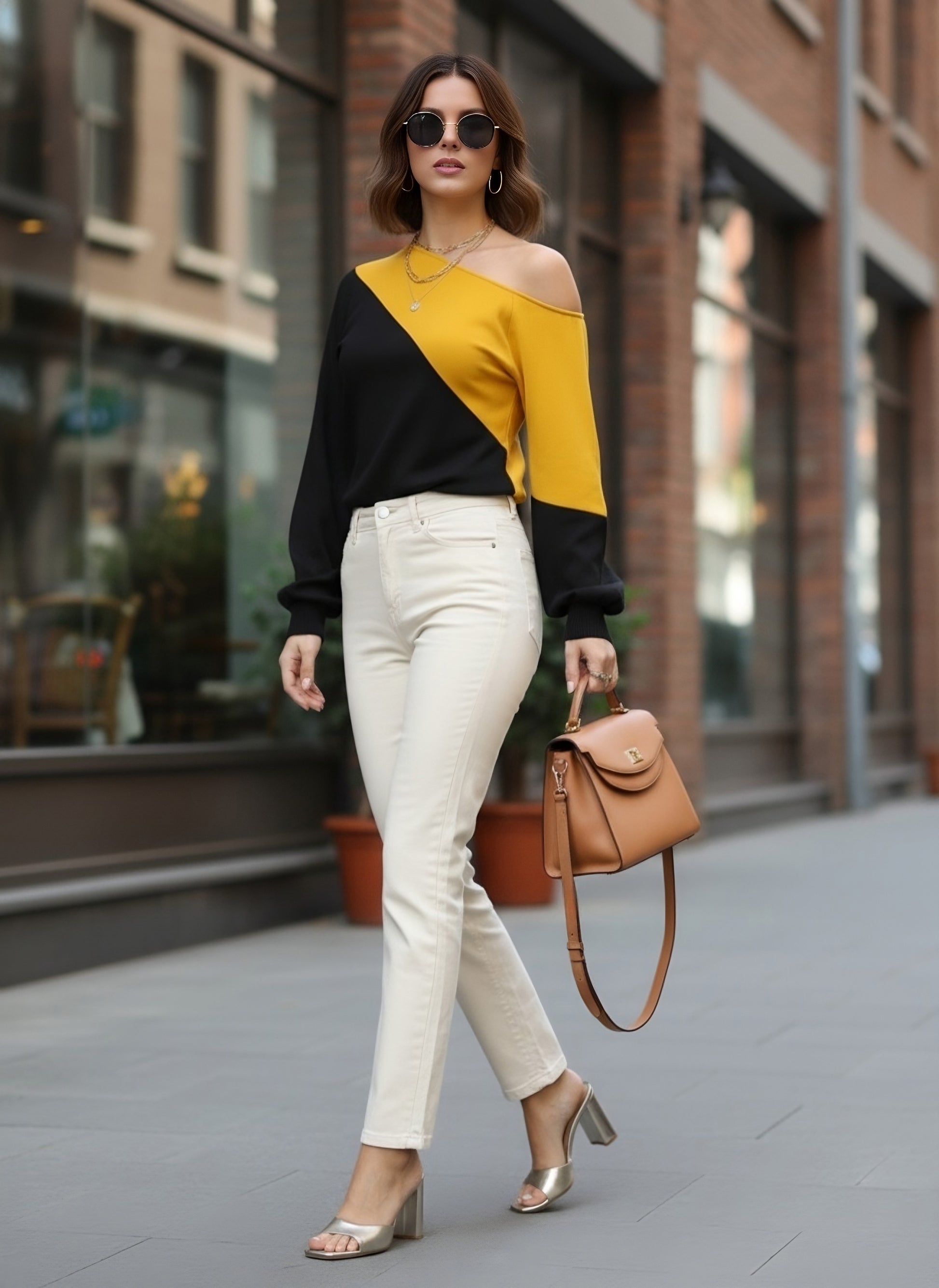 - A duo of black and mustard yellow shades gives this top a timeless look