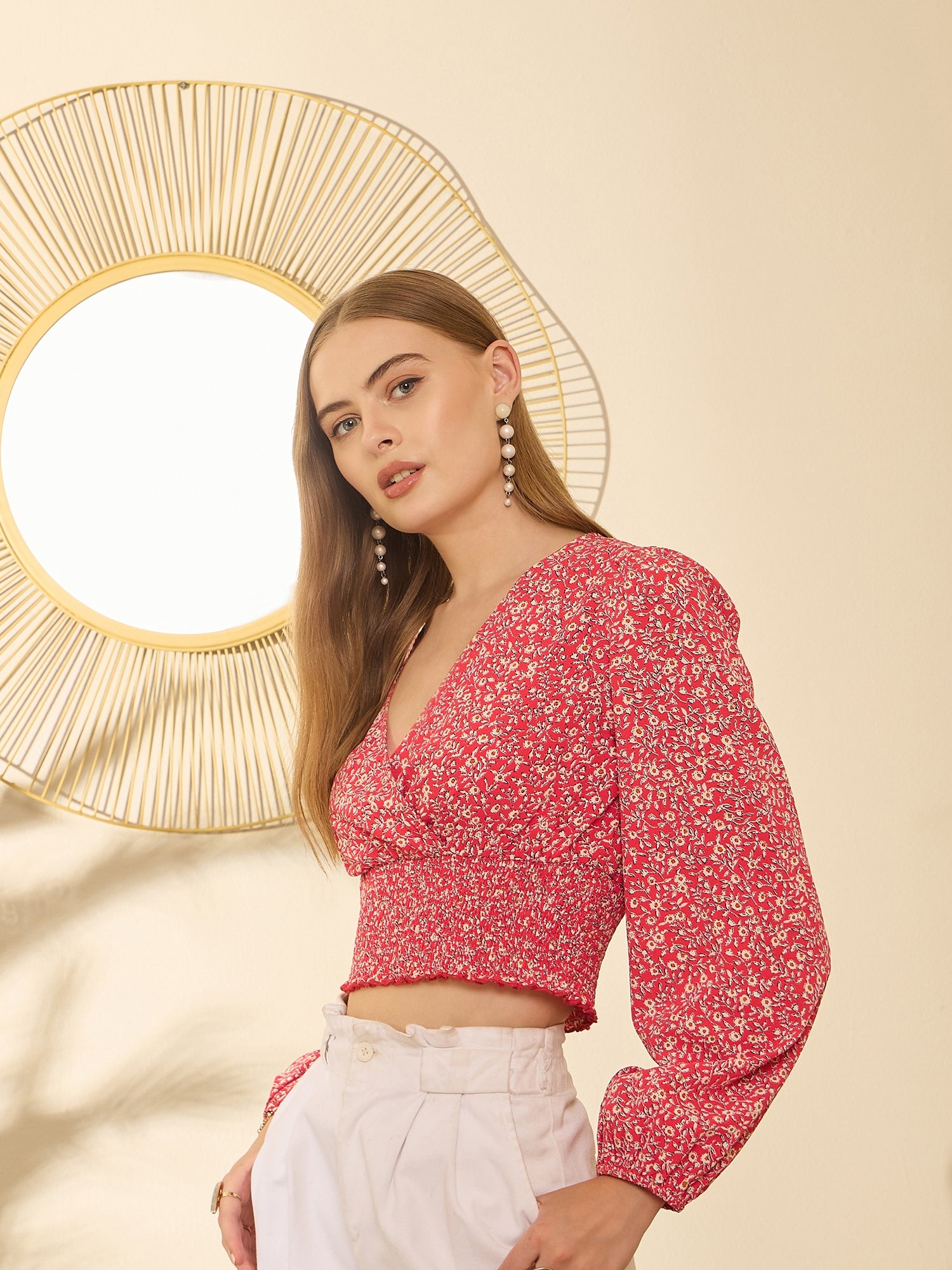Berrylush Women Red & White Floral Printed V-Neck Bishop Sleeves Smocked Crop Top