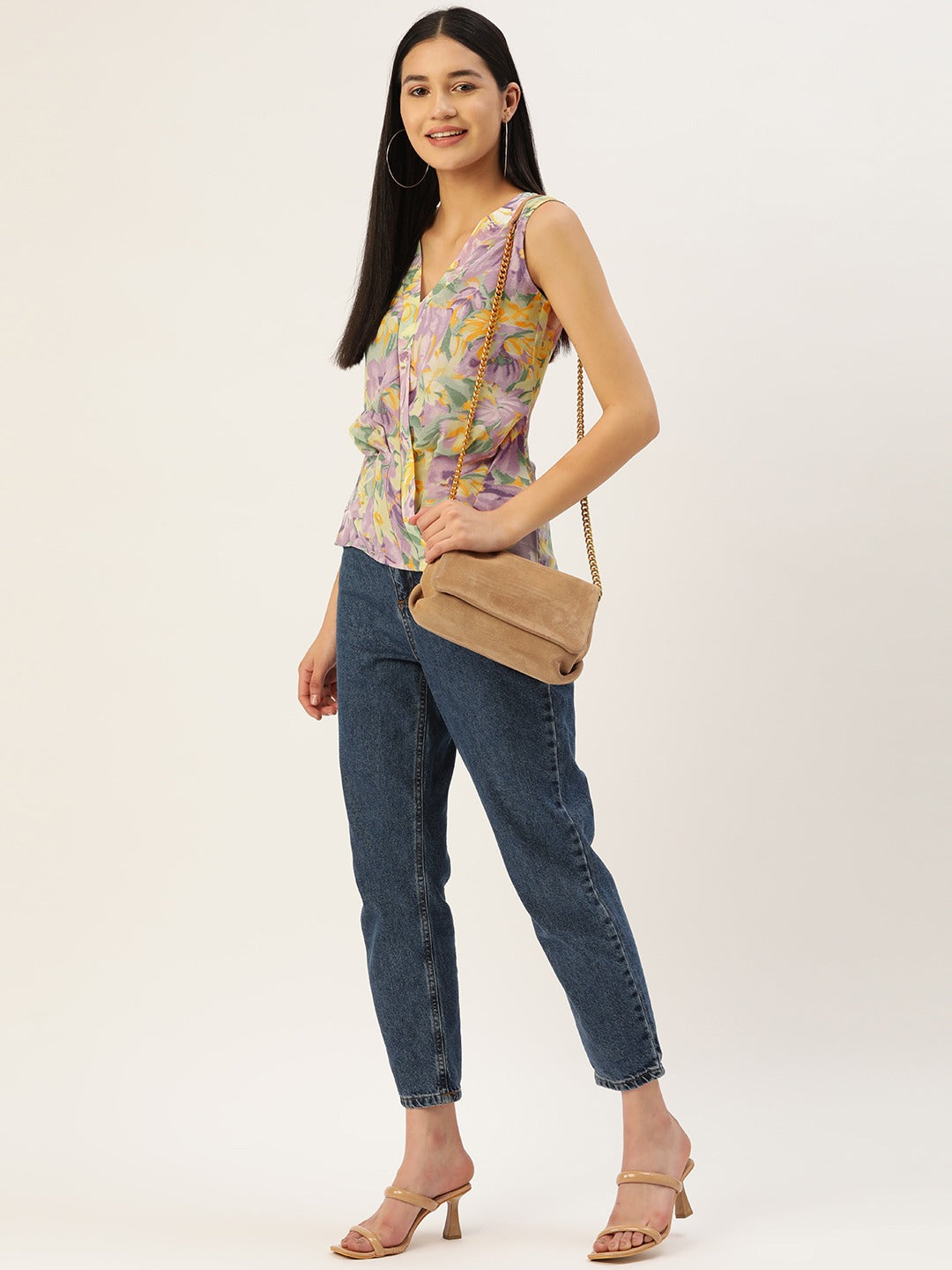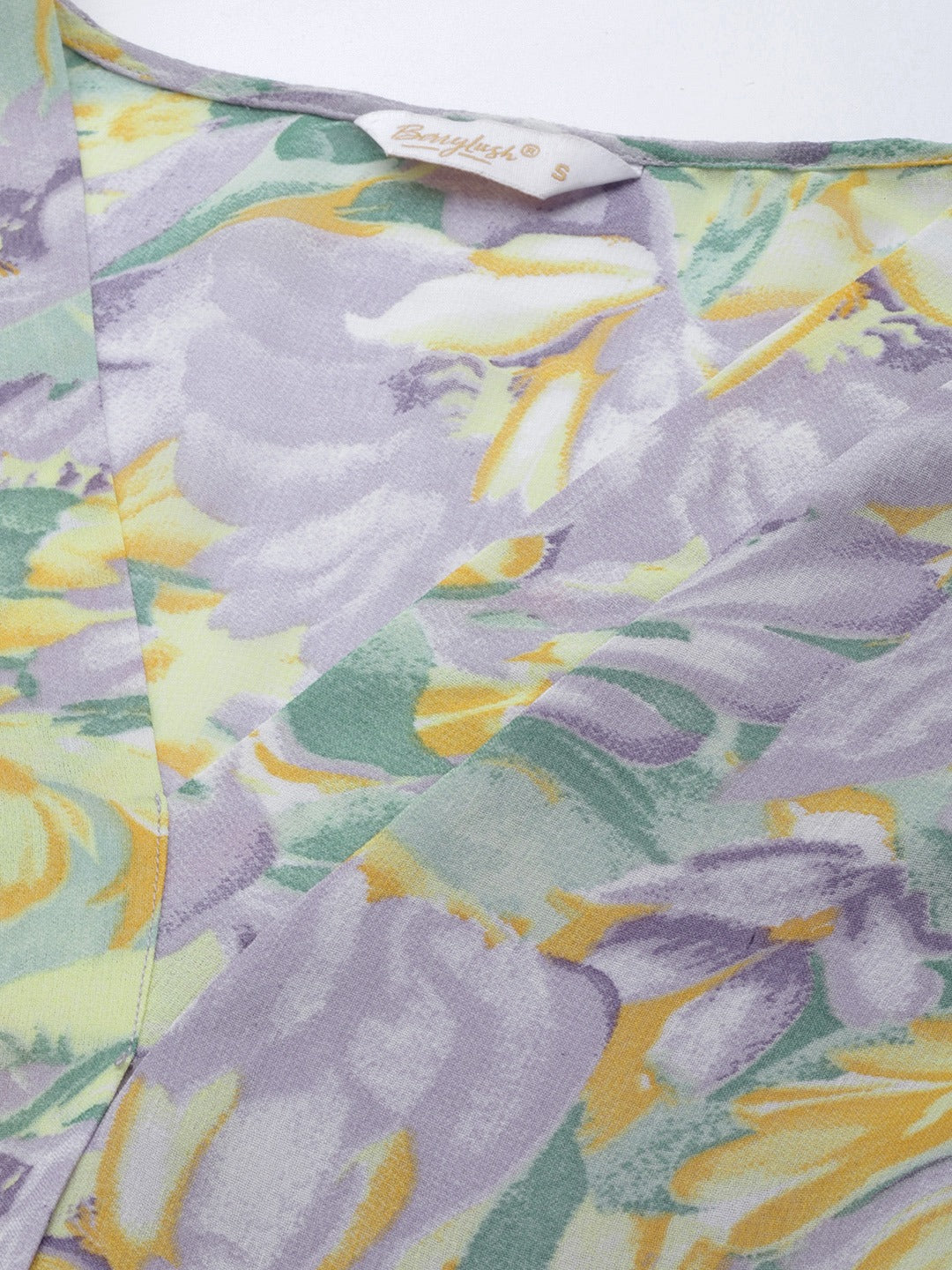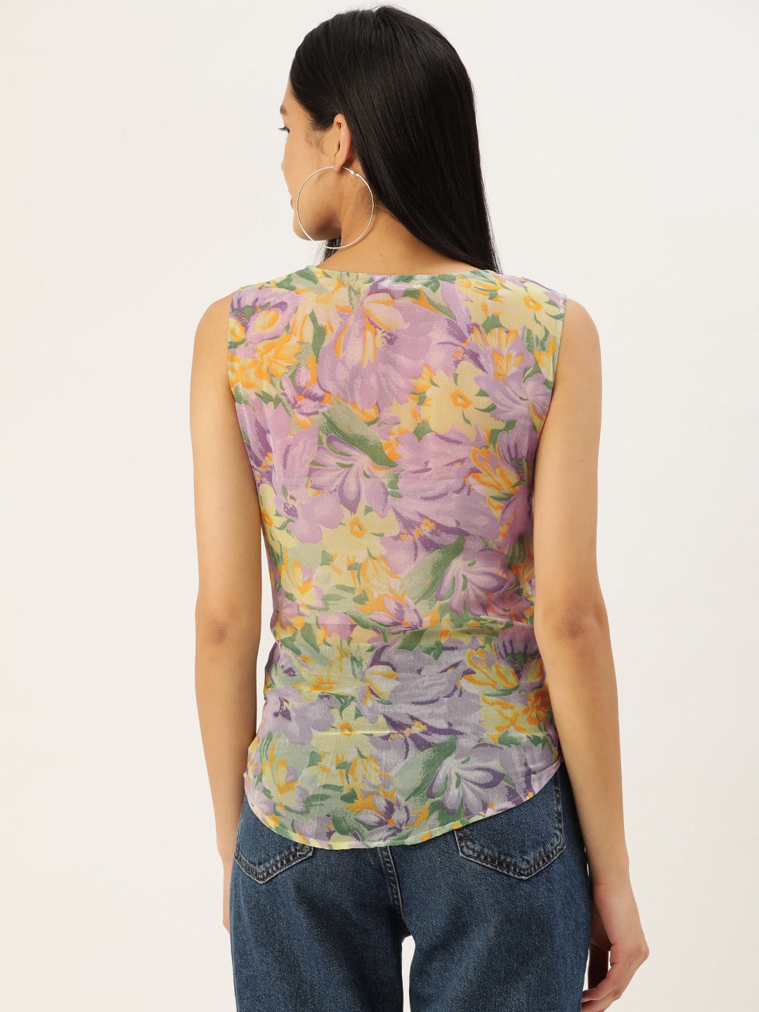 Spring is in sight, thus get your casual assortment ready with captivating floral ensembles just like this fabulous Purple Floral Print V-Neck Sleeveless Regular Top designed by Berrylush. Adorned with a beautiful amalgamation of purple and yellow floral print that gives this top a dash of playful elegance and chic appearance. Spun from breathable crepe polyester fabric that lends this top amusing moisture-wicking and anti-odour properties to keep your body fresh even during hot summer days. The regular length presents a realistic design of this top that offer proper coverage to your upper body with a cosy feel. Grab dinner with your office colleague while looking boho-chic by teaming this regular top with your favourite trousers, a pair of block heels, matching earrings, and a classy side bag.