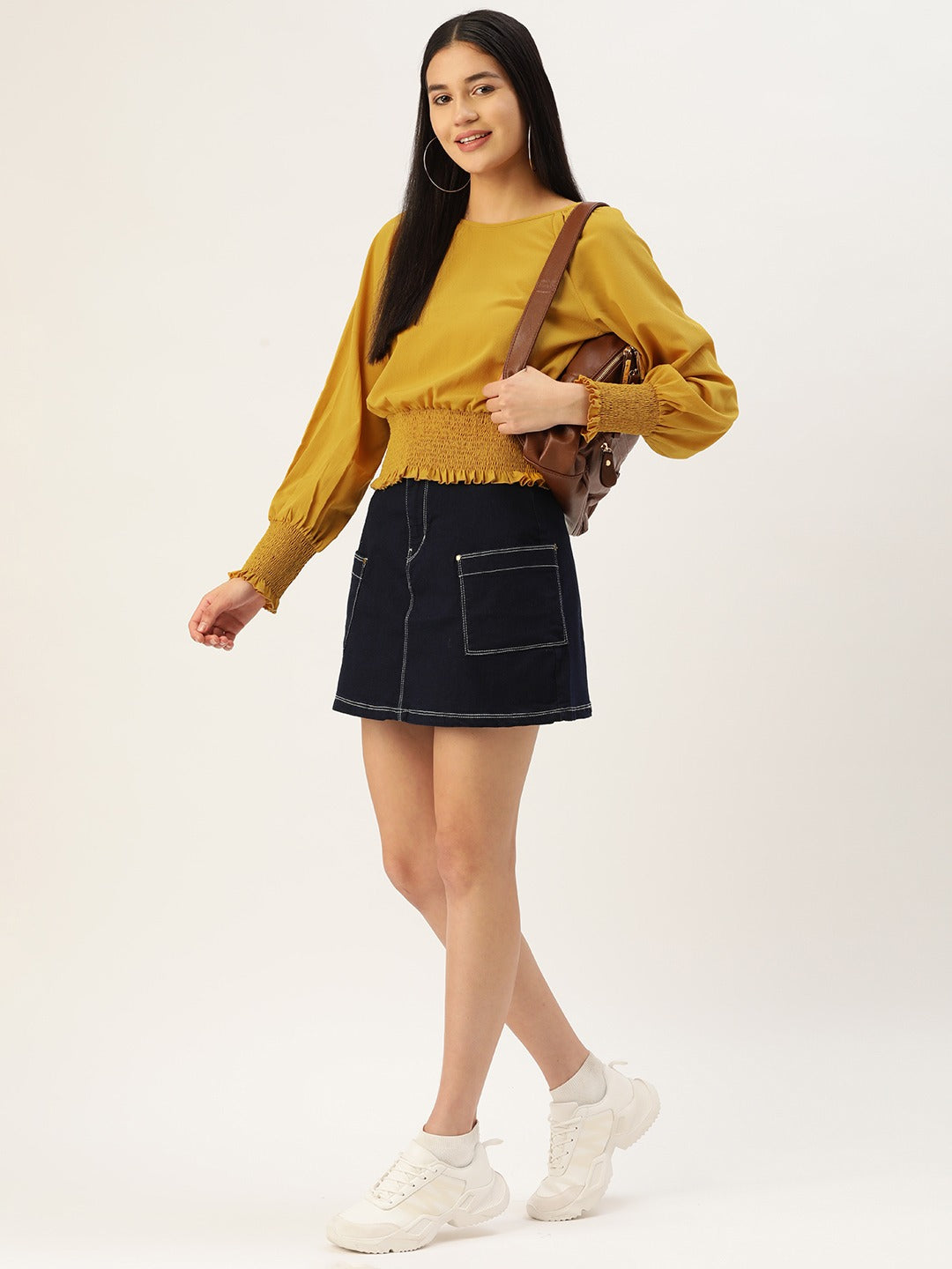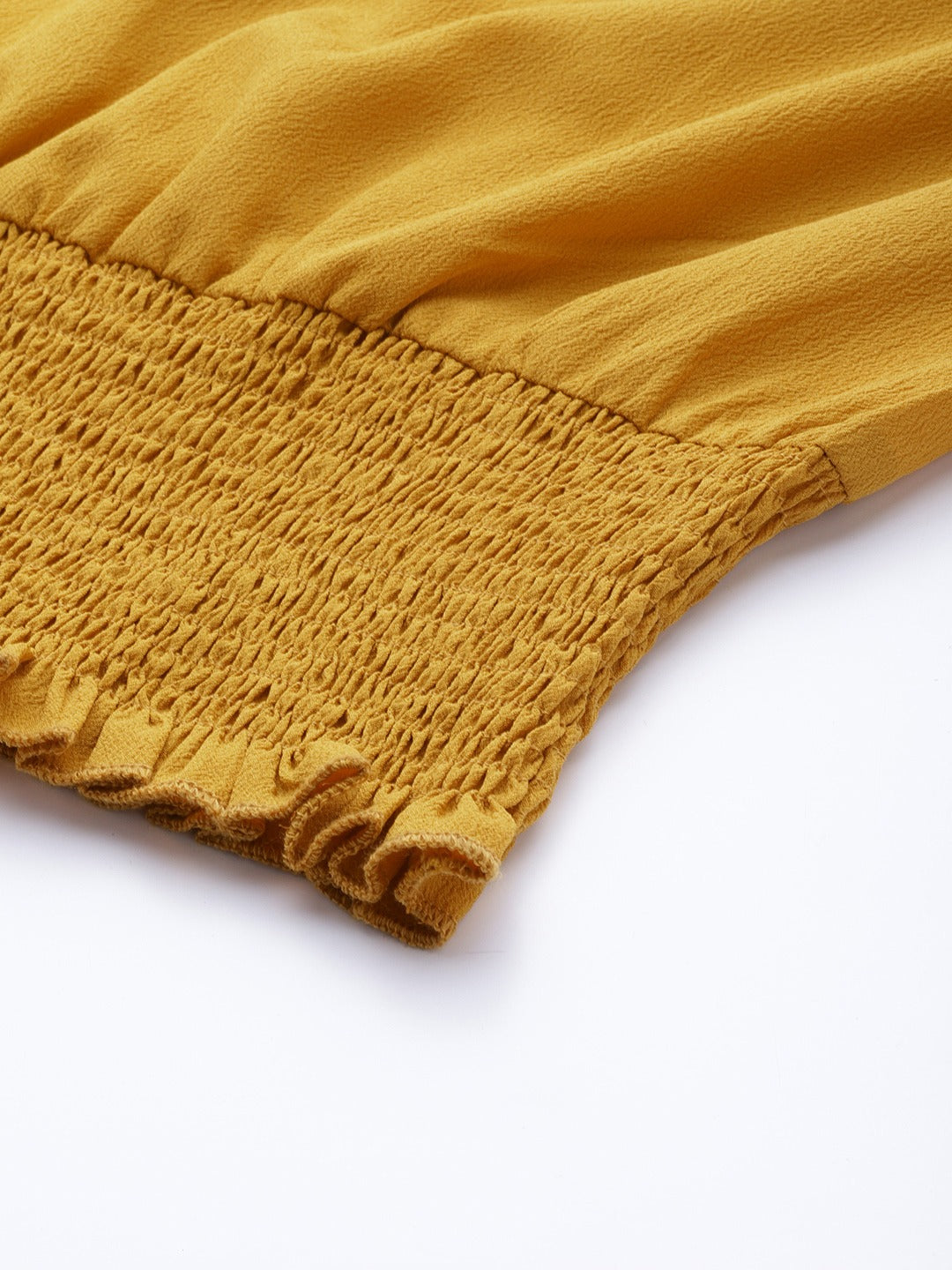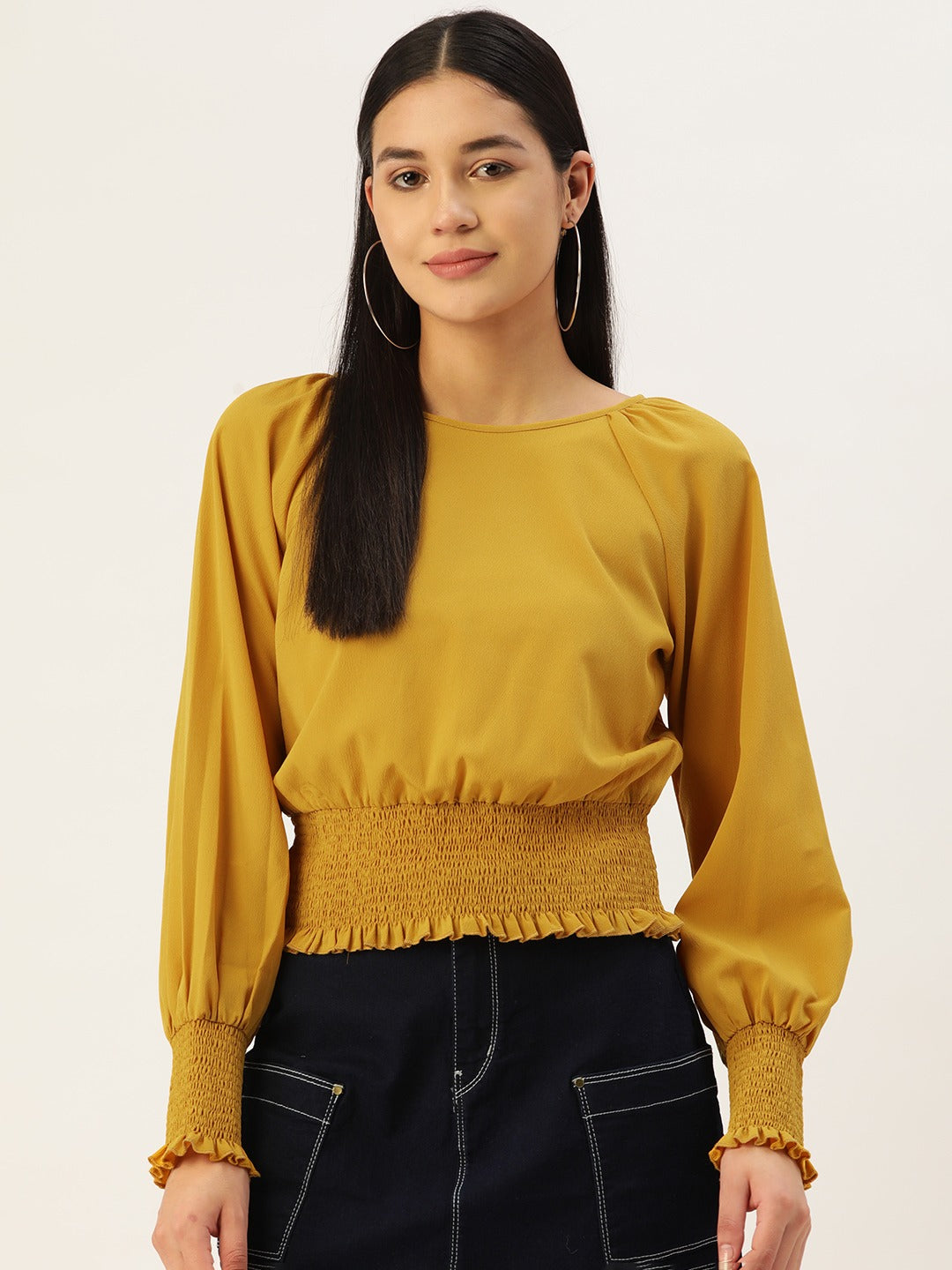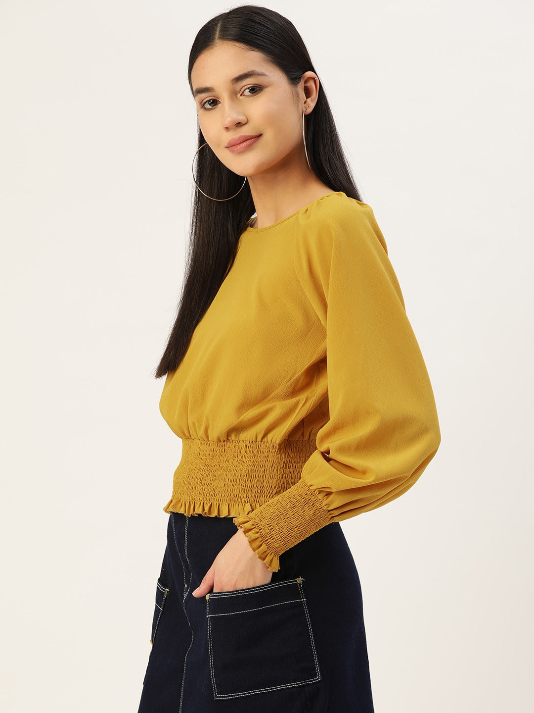 Berrylush Women Solid Yellow Round Neck Bishop Sleeves Crepe Smocked Crop Top