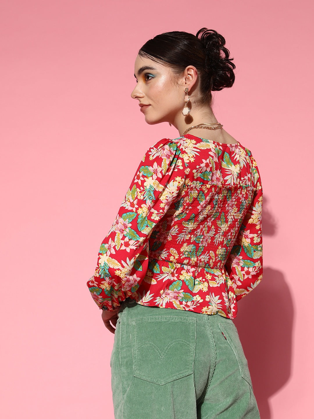 Berrylush Women Red & Multicolour Floral Printed Square Neck Bishop Sleeves Crepe Smocked Crop Peplum Top