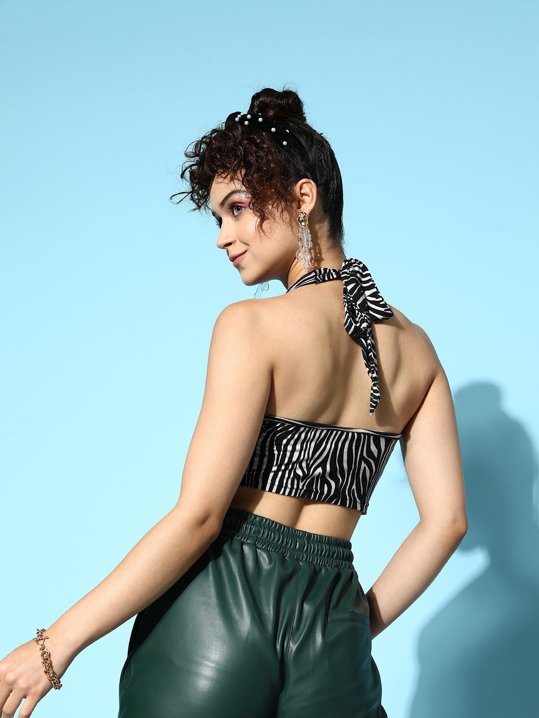 Berrylush Women White & Black Animal Print Halter Neck Sleeveless Tie-Up Backless Cotton Cropped Top