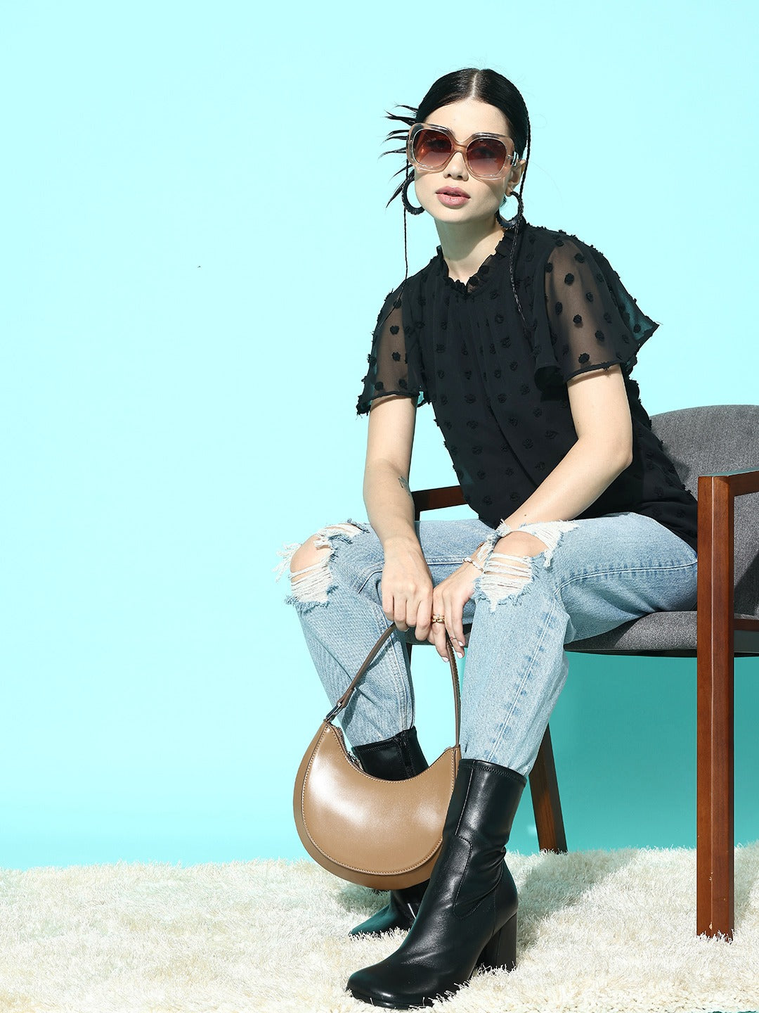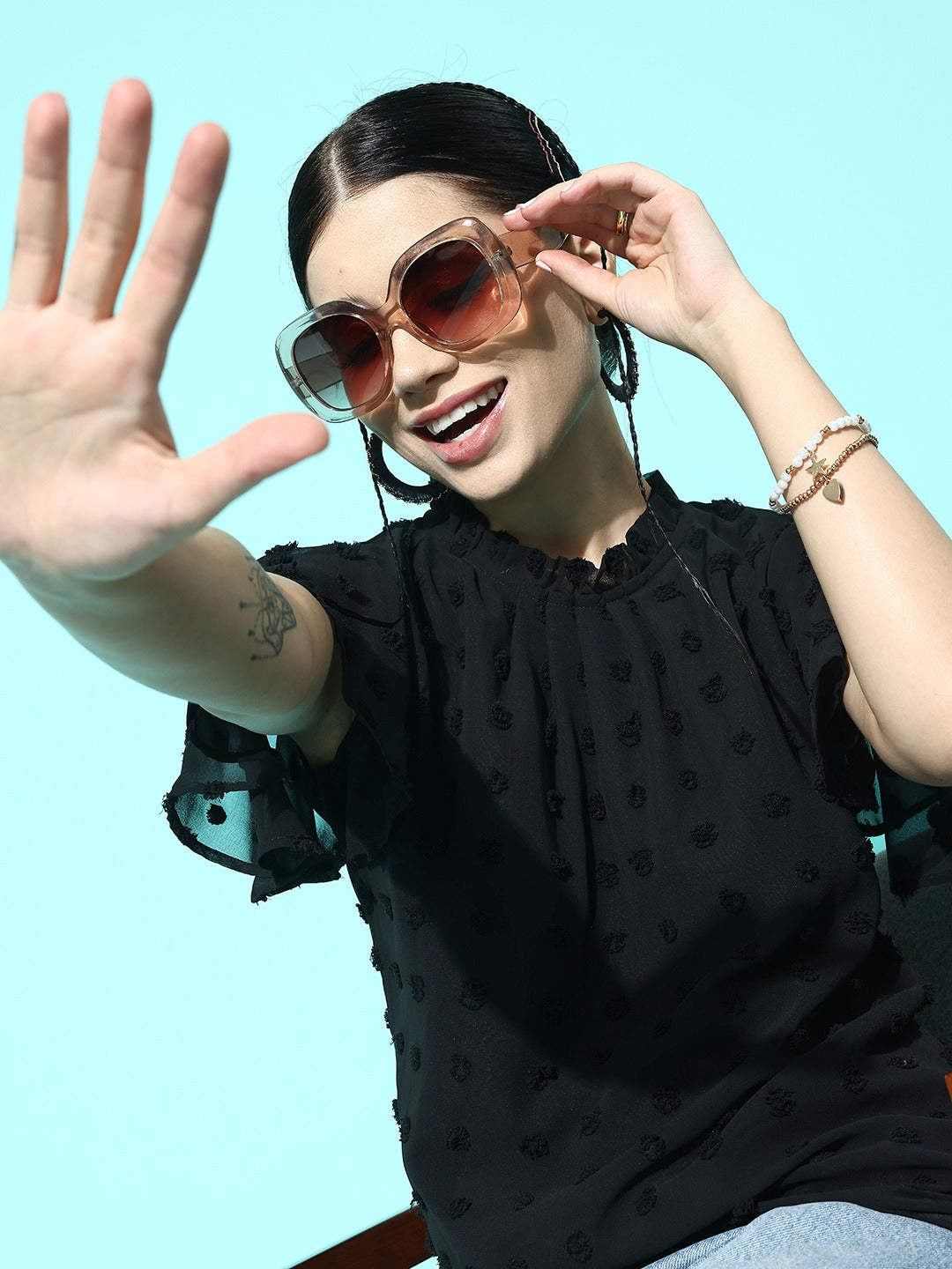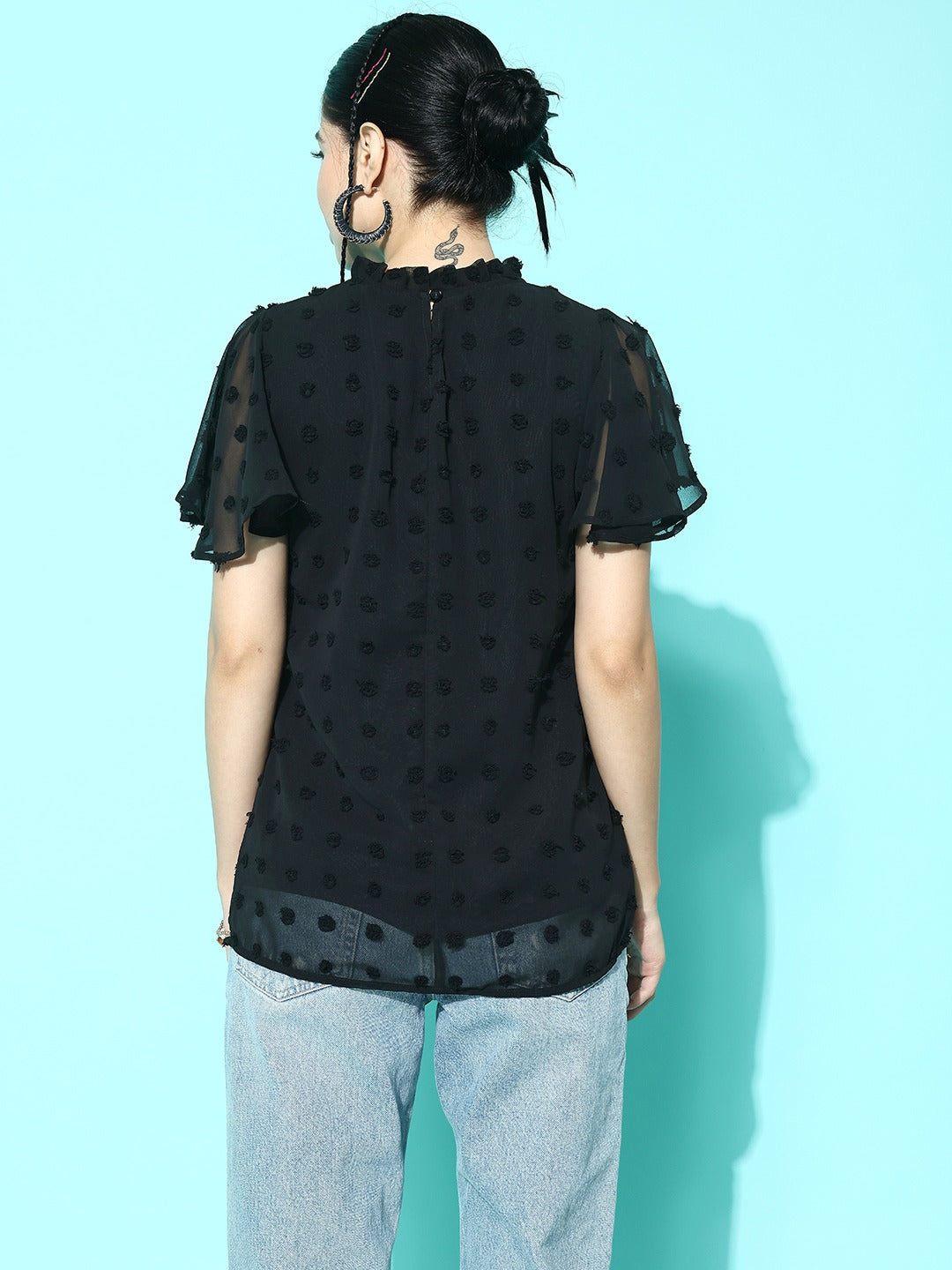 Berrylush Women Solid Black Dobby Weave Round Neck Flutter Sleeves Button-Up Jacquard Pleated Regular Blouson Top
