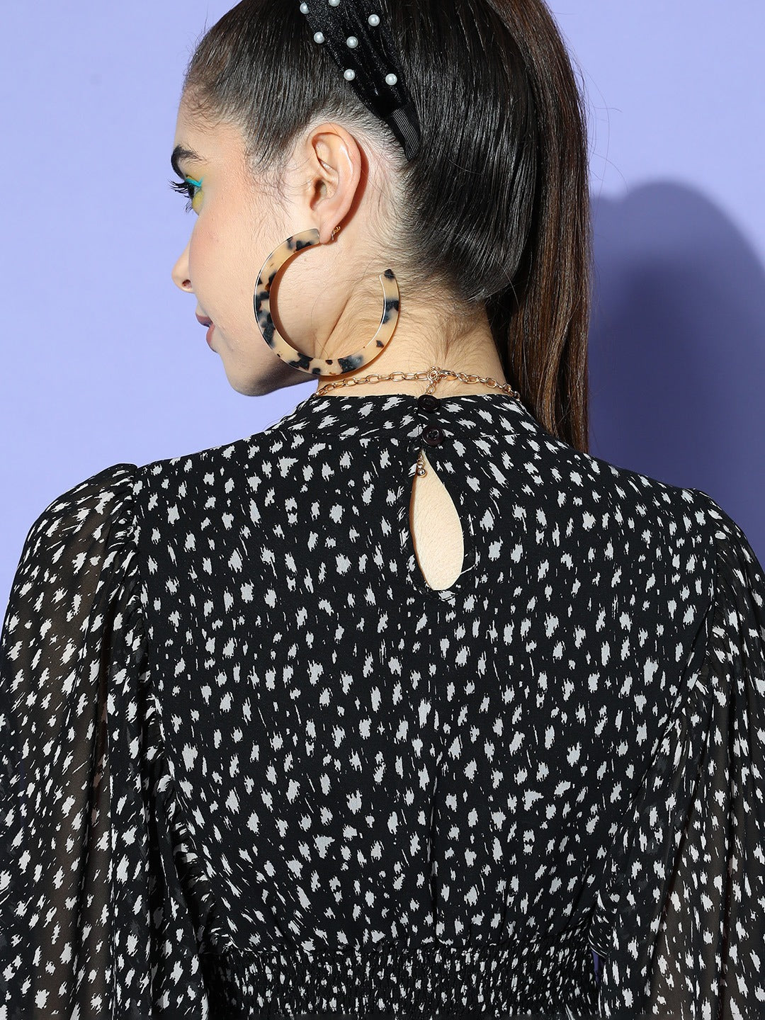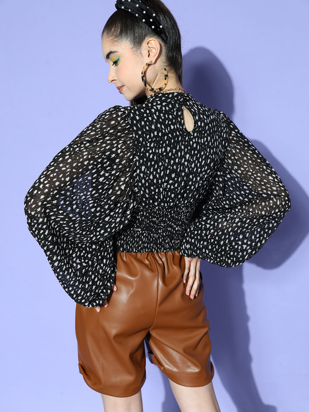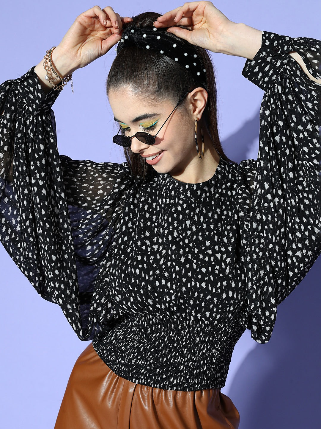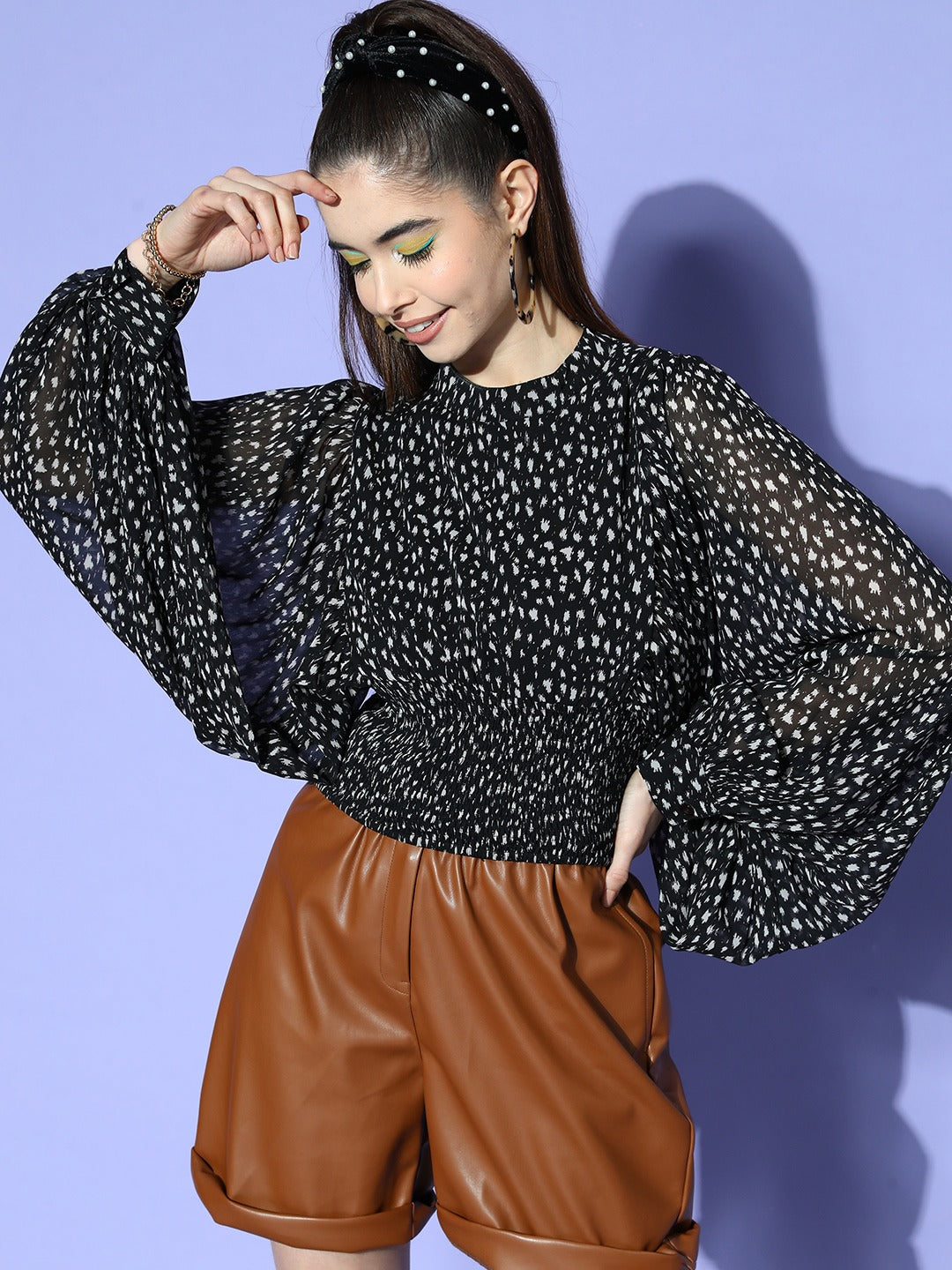 Berrylush Women Black & White Geometric Printed Round Neck Crepe Back Cutout Smocked Blouson Crop Top