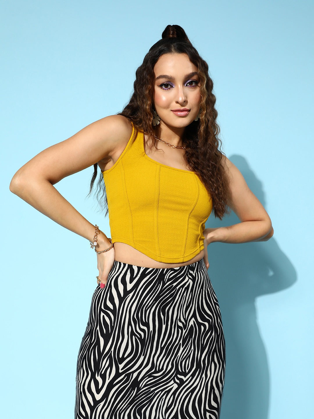 Step into the sunshine this summer season with a bold yet minimalistic signature style by donning this chic Solid Yellow Square Neck Fitted Crop Top from Berrylush. Spotlighting fitted style that lends this top form-fitting silhouette to elegantly outshine your natural curves without any discomfort. The cropped length injects an exotic feel to this top with an alluring appeal to your waistline area along with a versatile style note. Showcasing a sleeveless design that keeps your arms ventilated and cool all day long with endless layering opportunities. Wear this crop top with your favourite jeans, matching earrings, block heels, and a cute side bag to complete your casual look flawlessly.
