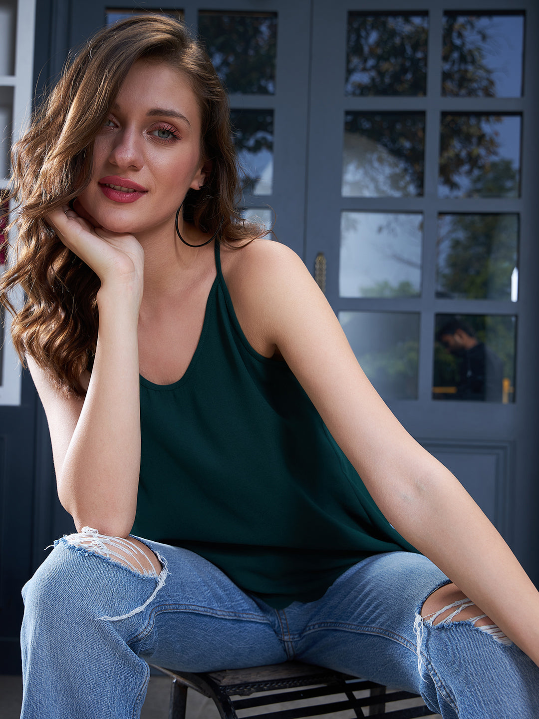 Berrylush Women Solid Green Round Neck Sleeveless Overlap Back Crepe Scallop Hem Cropped Top