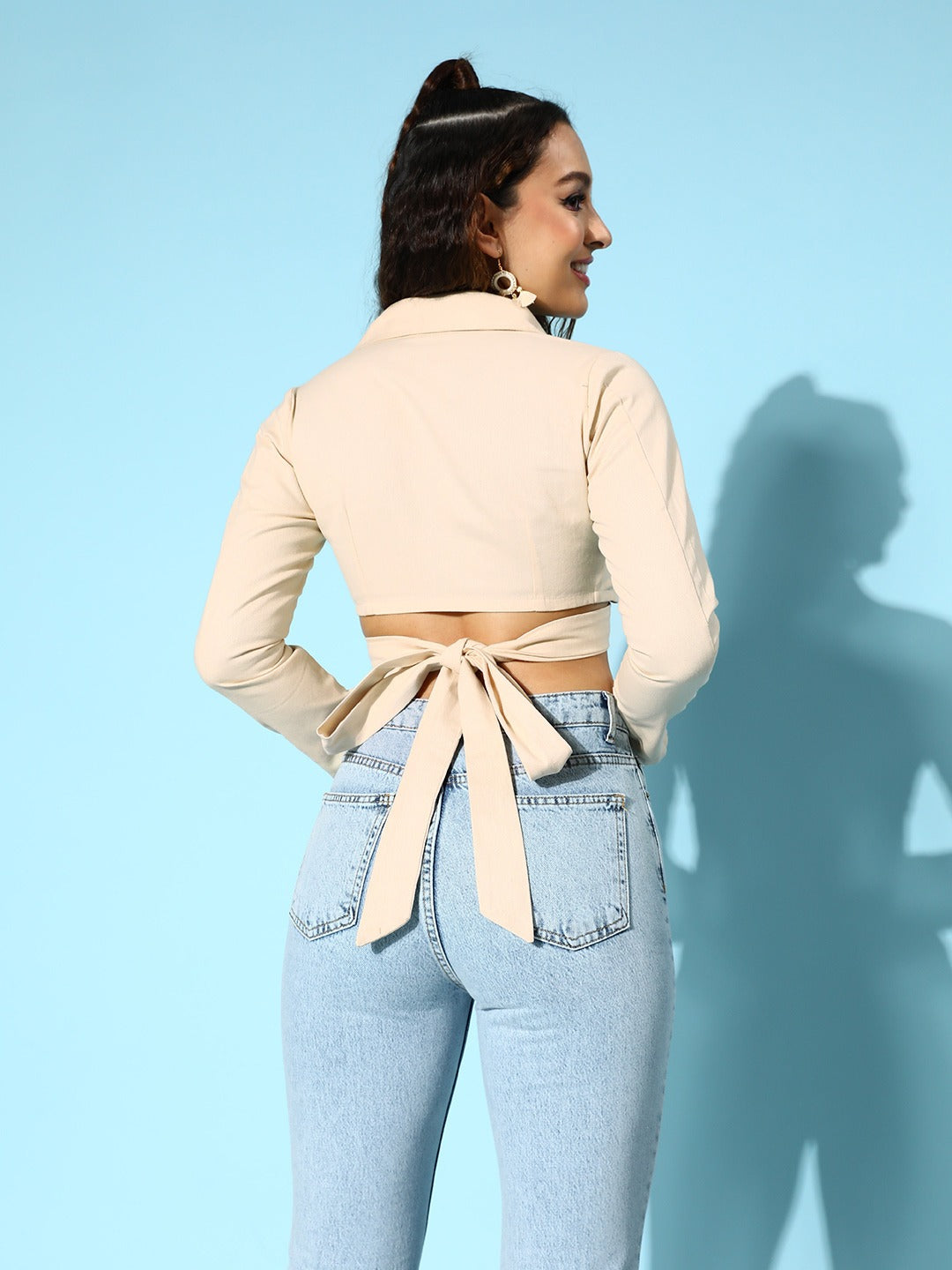 Opt for trendy fashion elements to effortlessly elevate your everyday look just like this beautiful Solid Beige V-Neck Fitted Crop Top introduced by Berrylush from its latest casual wear collection. Rendered from breathable cotton fabric that keeps this top lightweight with a super delicate touch while rubbing against your skin. Styled with long-regular sleeves that help to keep your arms cosy and protected from suntan. Also, the tie-up closure makes this top easy to pull on and off without much hassle. To create a fashion-focused look you can partner up this top with matching parallel trousers, pearl stud earrings, block heels, and a classy handbag.