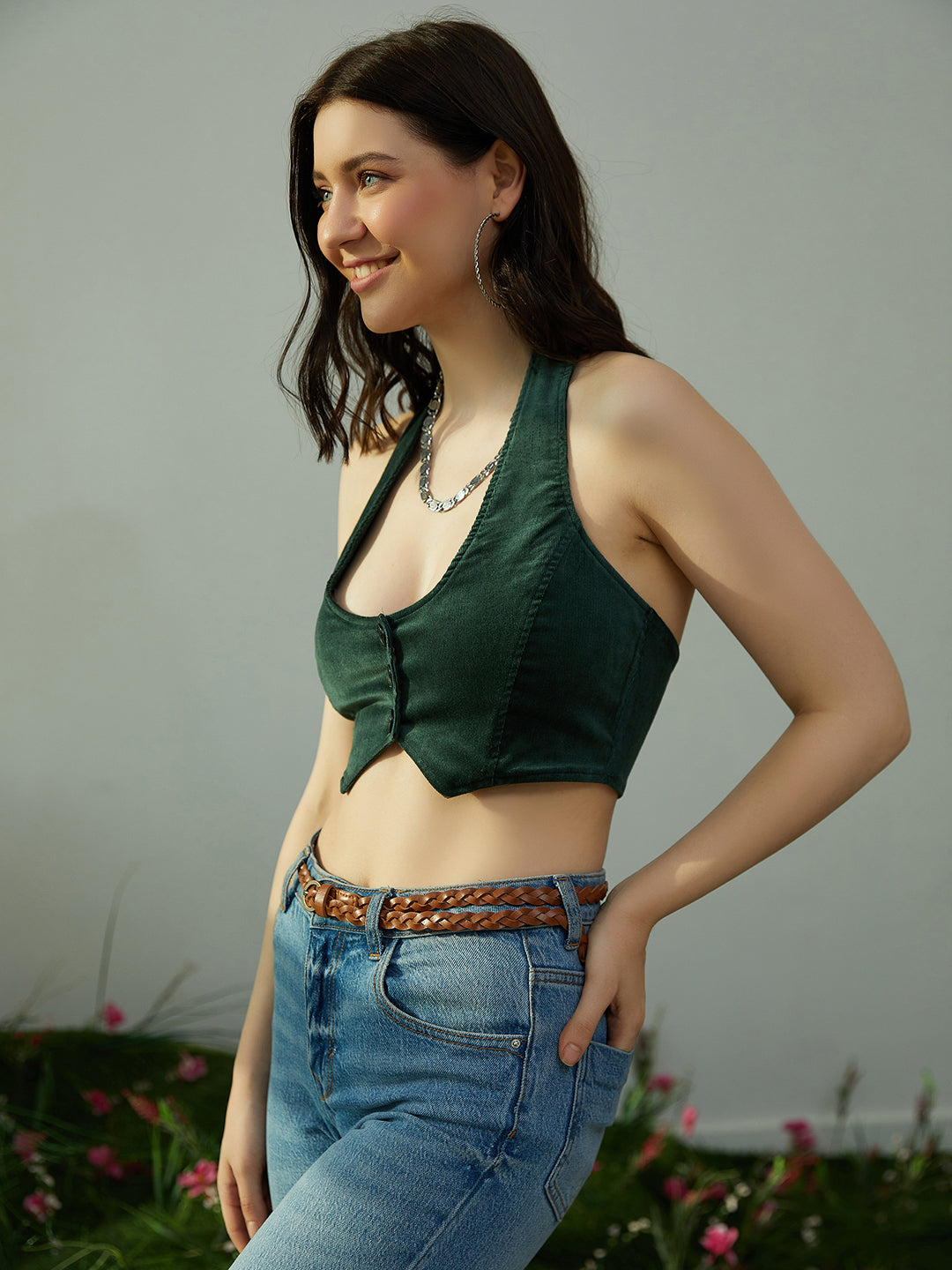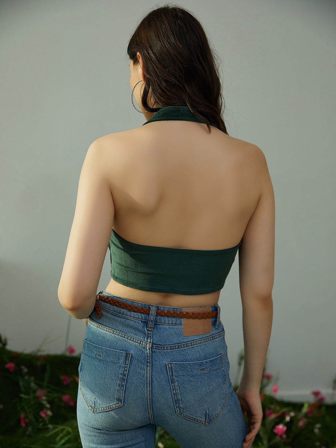 Berrylush Women Solid Green Halter Neck Sleeveless Front Button-Up Backless Cotton Cropped Top
