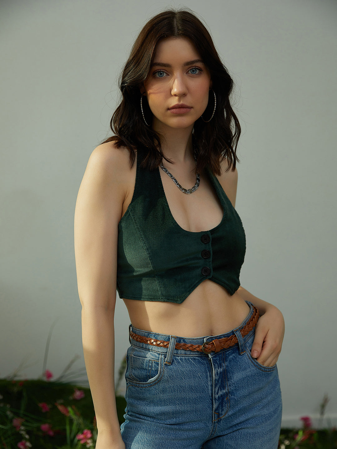 Power up your party wardrobe with vintage style factors by adding to your cart this glamorous Solid Green Halter Neck Backless Crop Top designed by Berrylush. The sleeveless design adds a dash of versatility to this top with a layering option that makes it a perfect addition. Displaying styled back design that gives this top an enchanting appearance with a burst of mesmerizing charm. The cropped length beautifully showcases your waistline area with free and comfortable movements. Hit the dance floor looking gorgeous by pairing this crop top with your favourite trousers, a pair of high heels, minimalistic golden jewellery, and a classy clutch.
