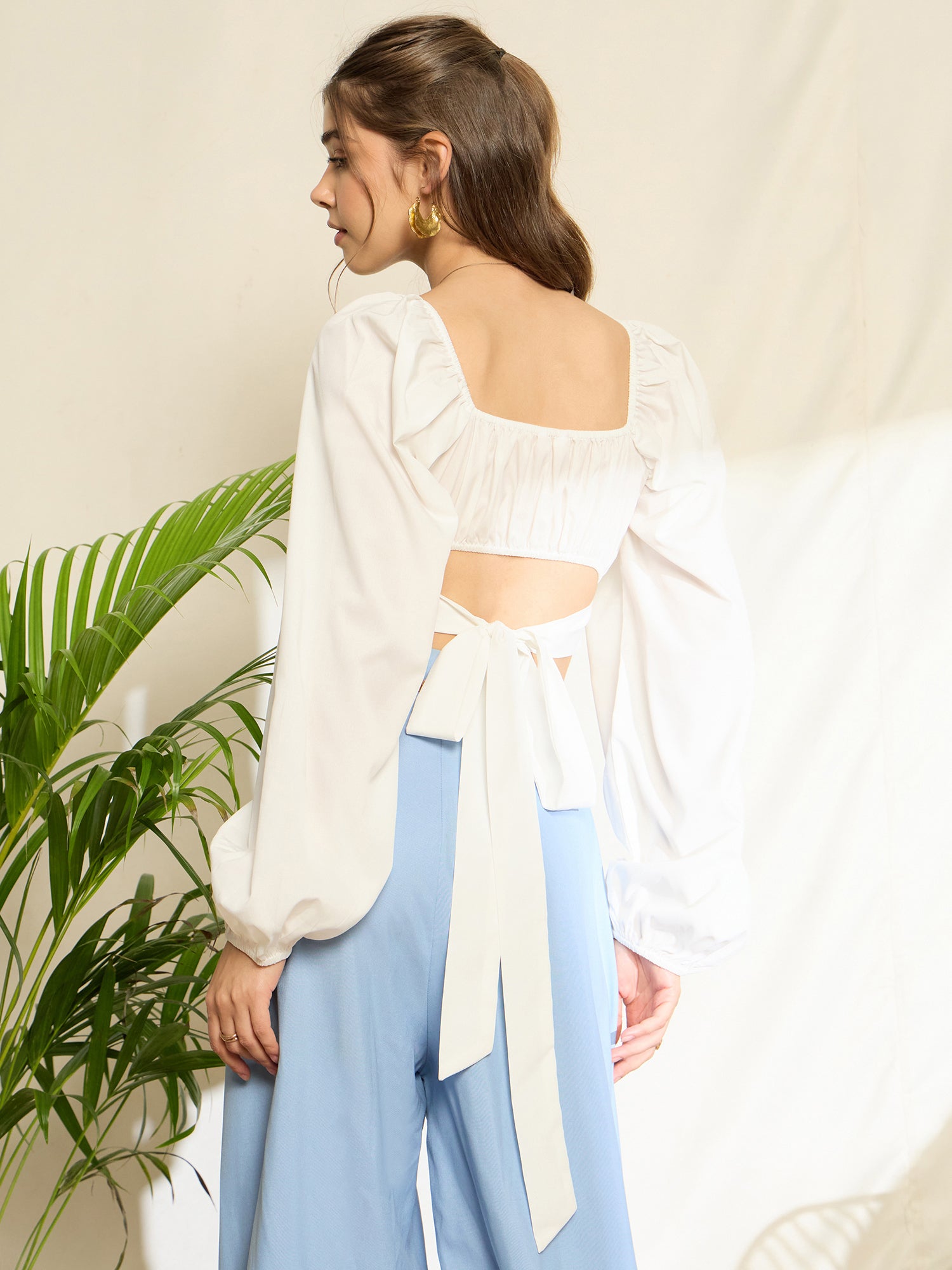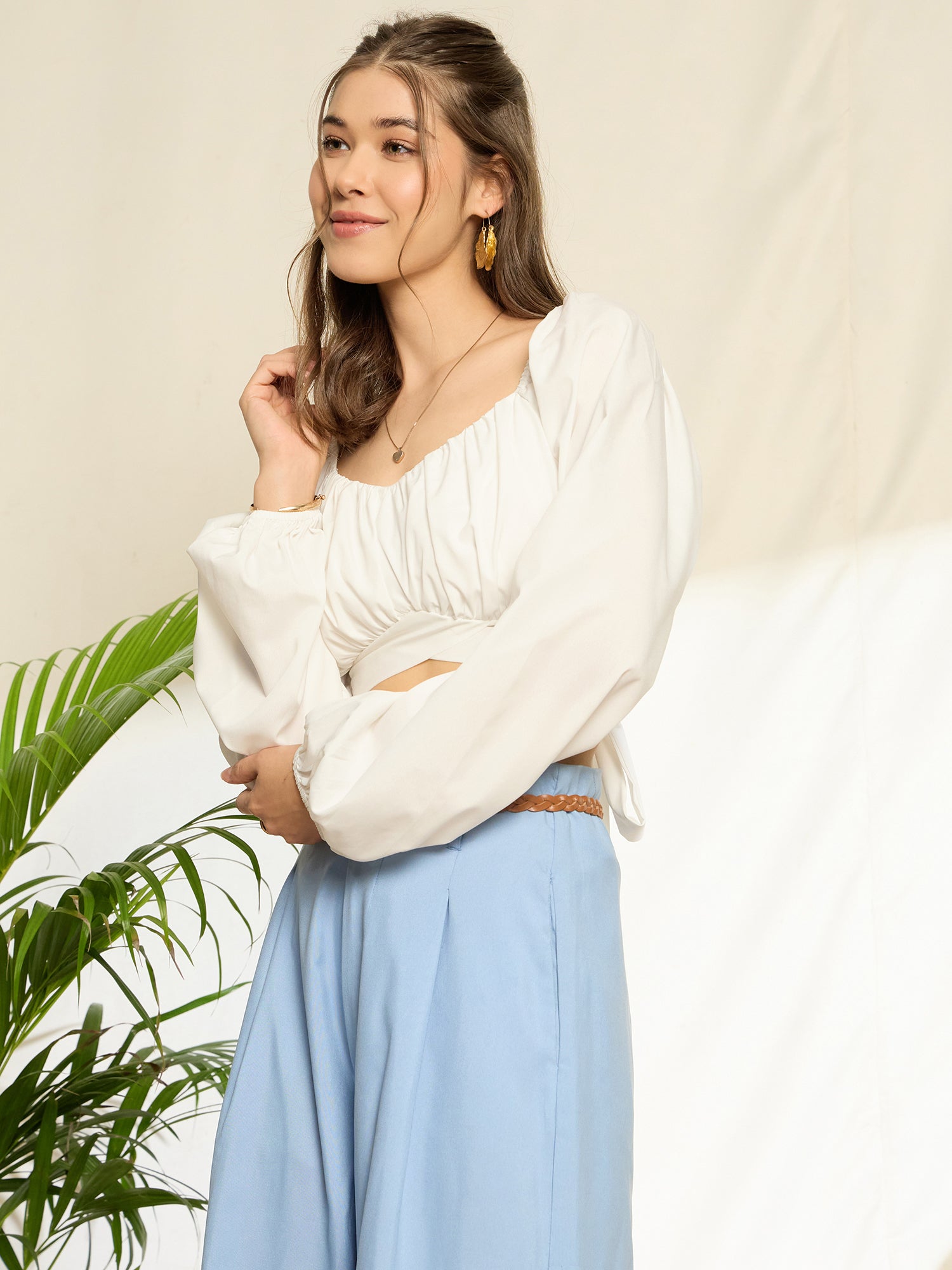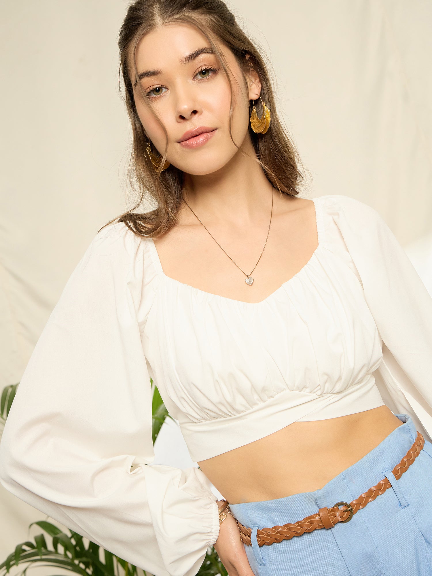 Berrylush Women Solid White Sweetheart Neck Bishop Sleeves Back Tie-Up Pleated Crop Top