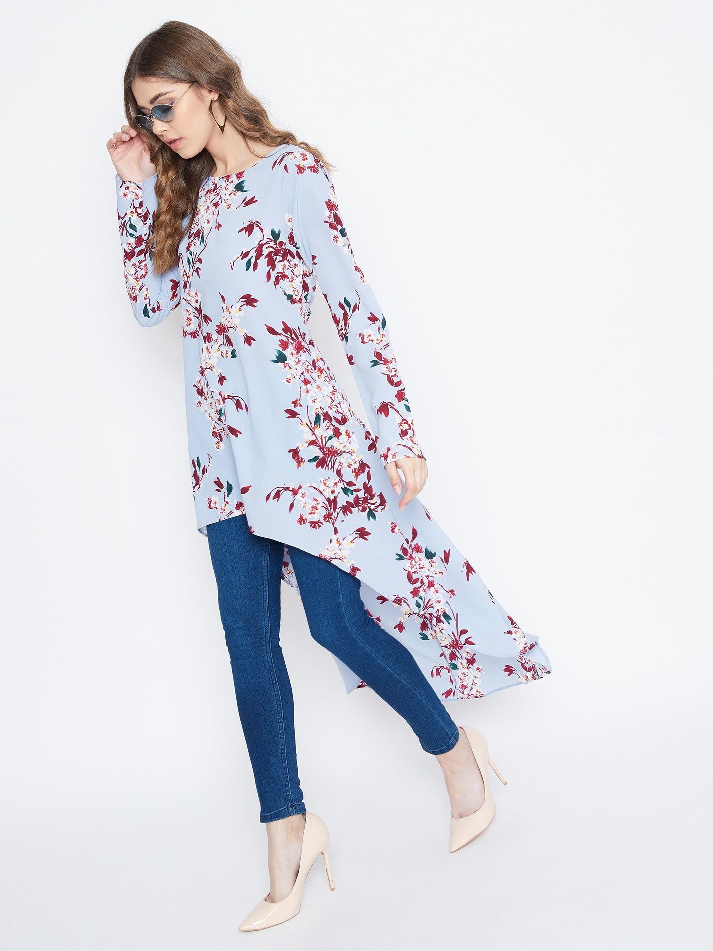 Berrylush Women Blue Floral Printed Round Neck High Low Top