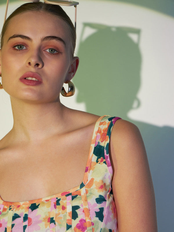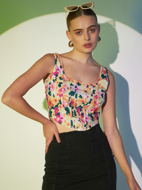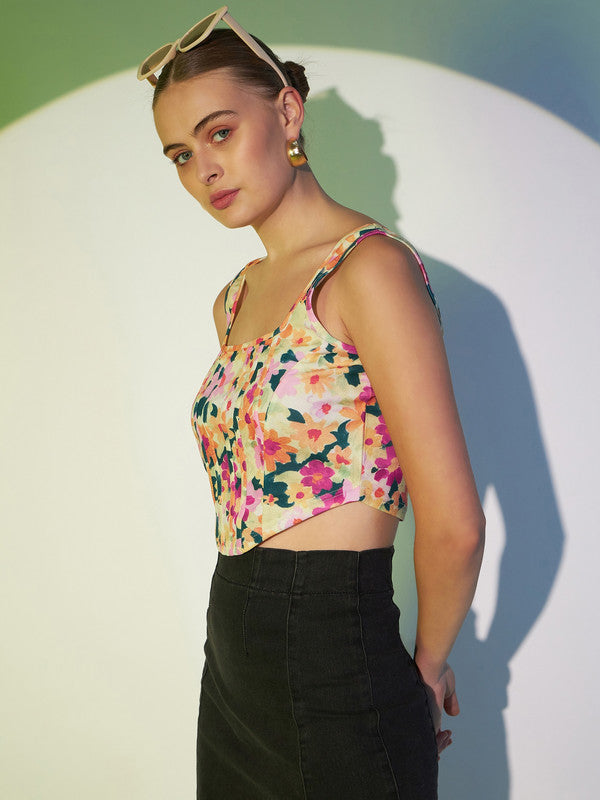 Berrylush Women White & Pink Floral Printed Square Neck Sleeveless Knitted Crop Tank Top