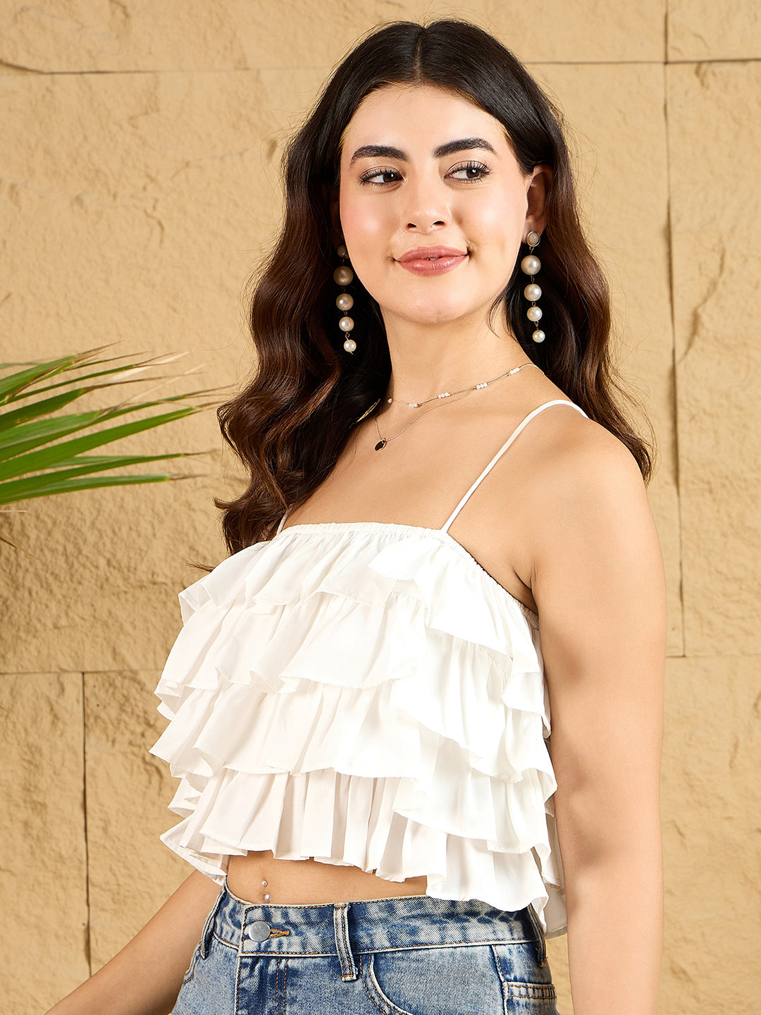 Berrylush Women Solid White Square Neck Sleeveless Ruffled Crop Cami Top