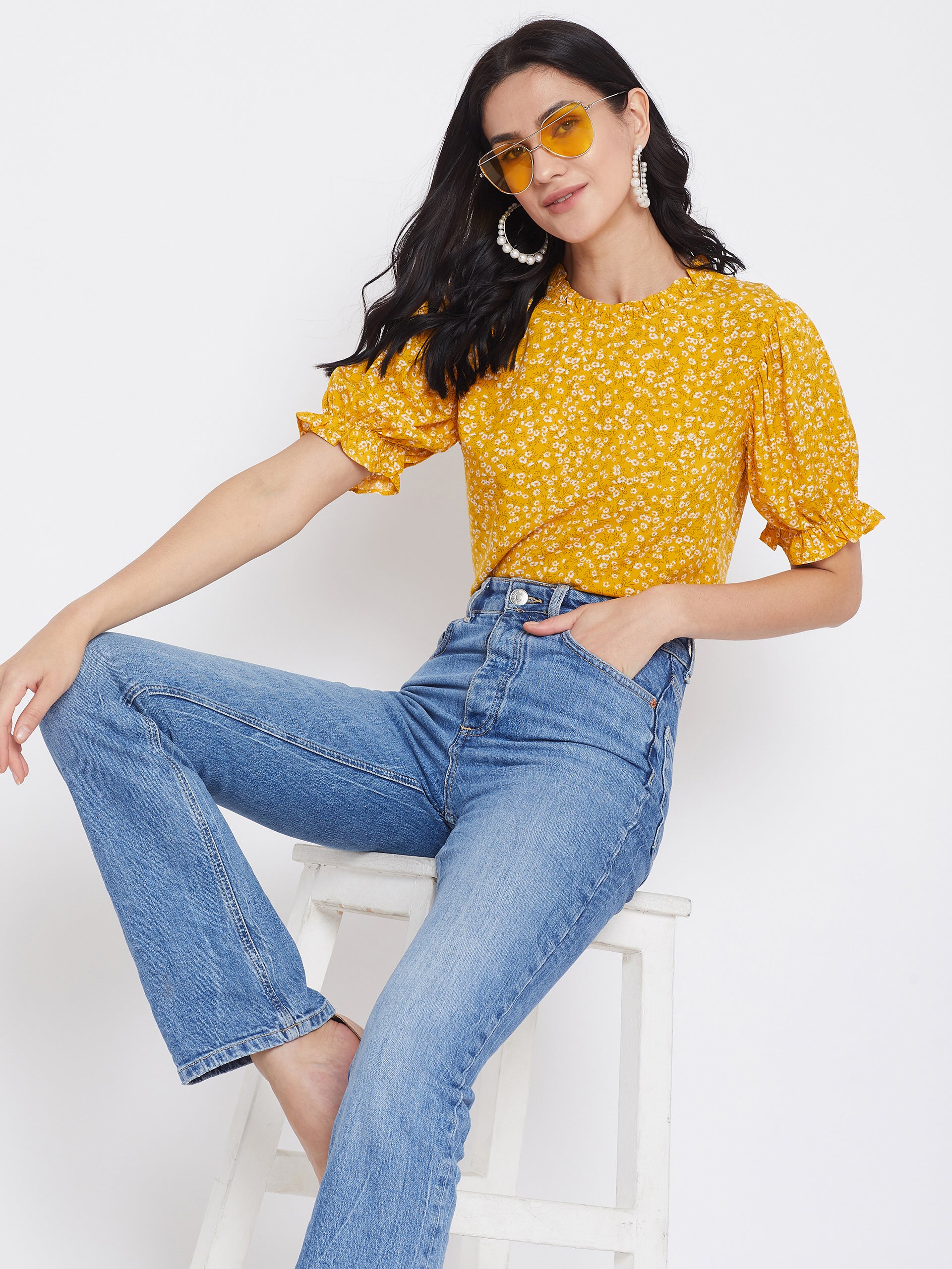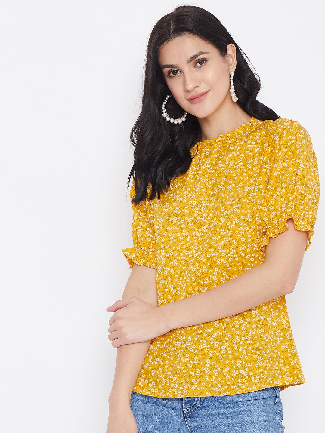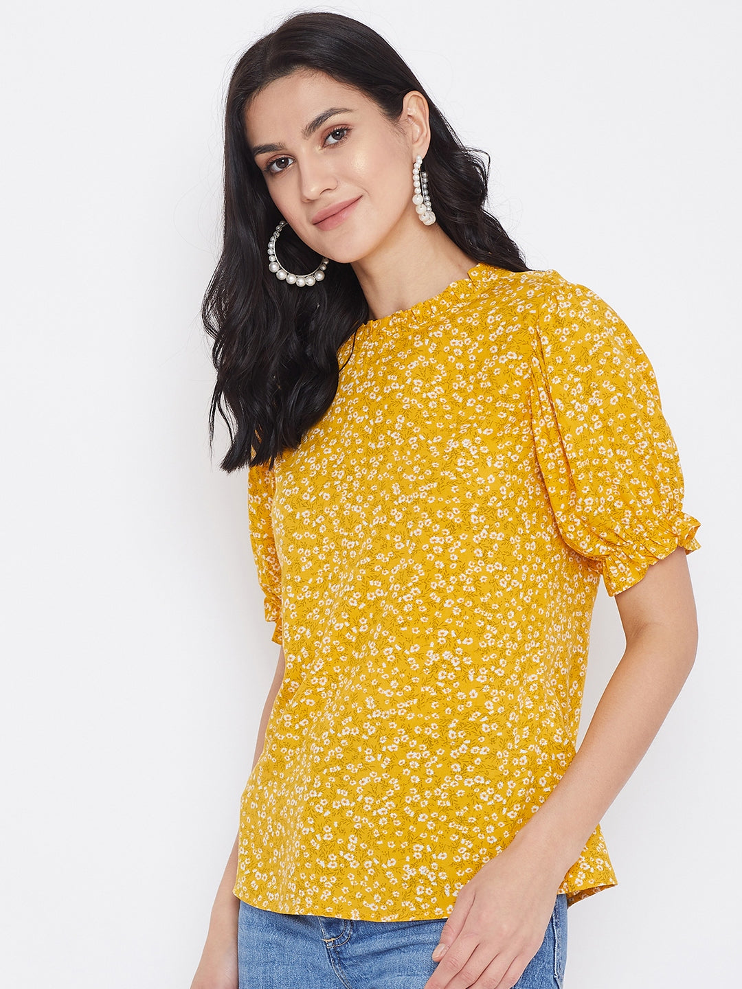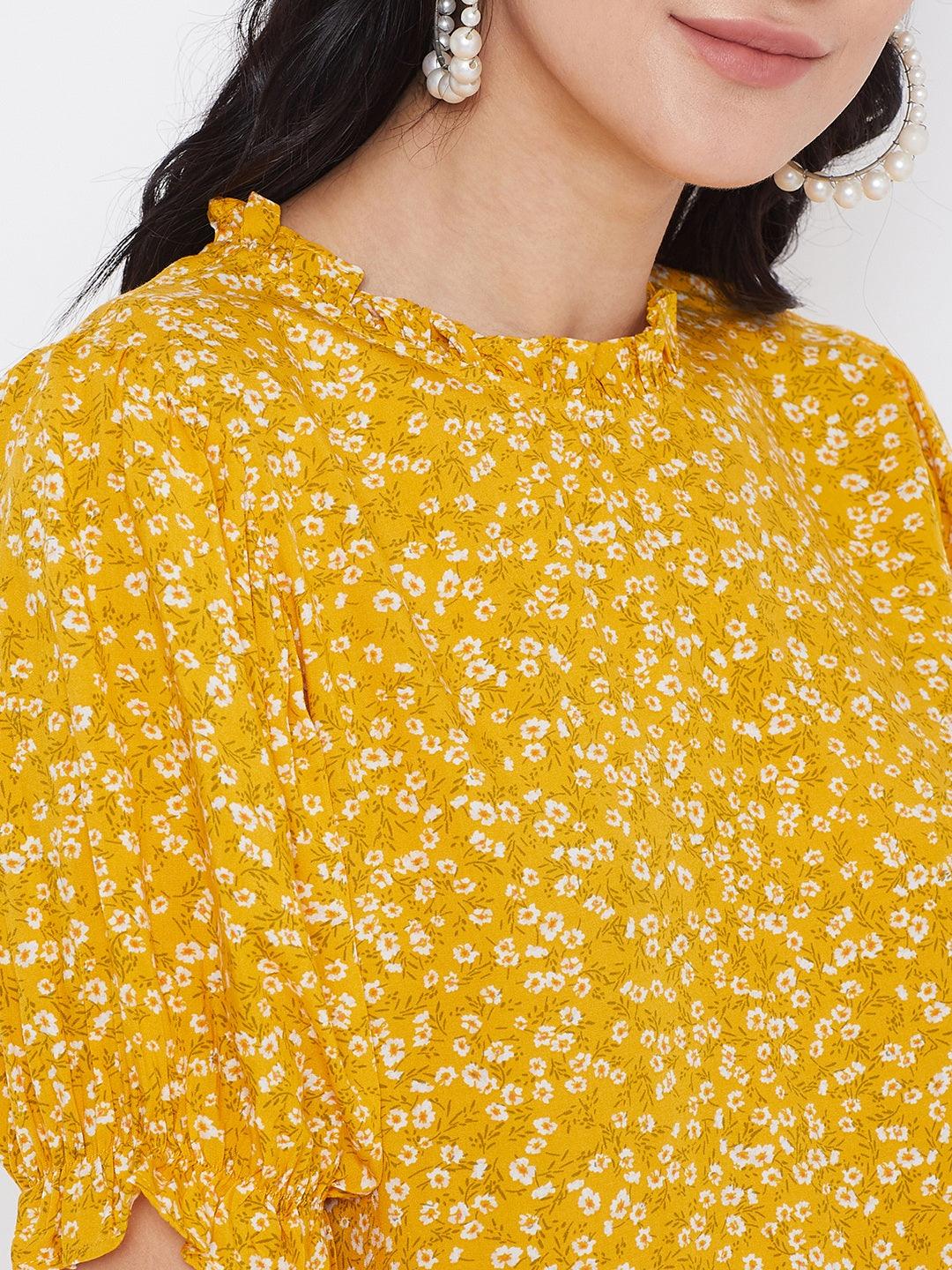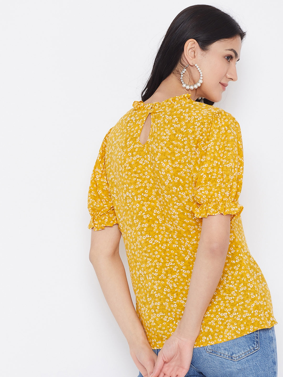 You will grab everybody's attention by putting on this gorgeous Yellow Floral Printed Puff Sleeves Top by Berrylush. The combination of white-colored floral print on a yellow base makes this top a wardrobe staple as day wear. The regular cut with the interesting puffed sleeves and mini ruffles helps you to look acute & saucy. Crafted with crepe polyester fabric and woven weave to offer enhanced durability and comfort. Button closure and keyhole detailing at the back give this top a fashionable look. Match this amazing top with low-waisted skinny jeans and high-top boots for a casual appearance. The everyday makeover is an excuse for a new trend thus buy often from Berrylush and dress like a trendsetter.