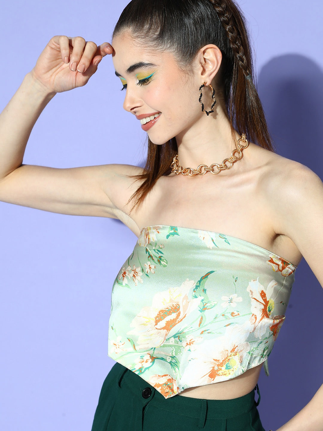 Redefine your casual style with exotic and eccentric fashion elements by opting for this stunning Green Floral Print Strapless Tube Crop Top from the latest print and pattern collection of Berrylush. Flaunting tube style that gives this top a sexy yet cute style note while keeping your upper body cool during hot summer days. Featuring sleeveless designs that lend your arms an alluring appeal with endless options for layering at your convenience. The cropped length offers your waist area a sensual appearance with tempting exposure. You can wear this crop with a mini skirt, caged heels, pearl stud earrings, and a cute side bag to get a glamorous look for your next date night plan.