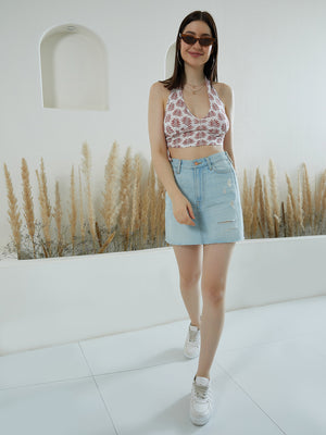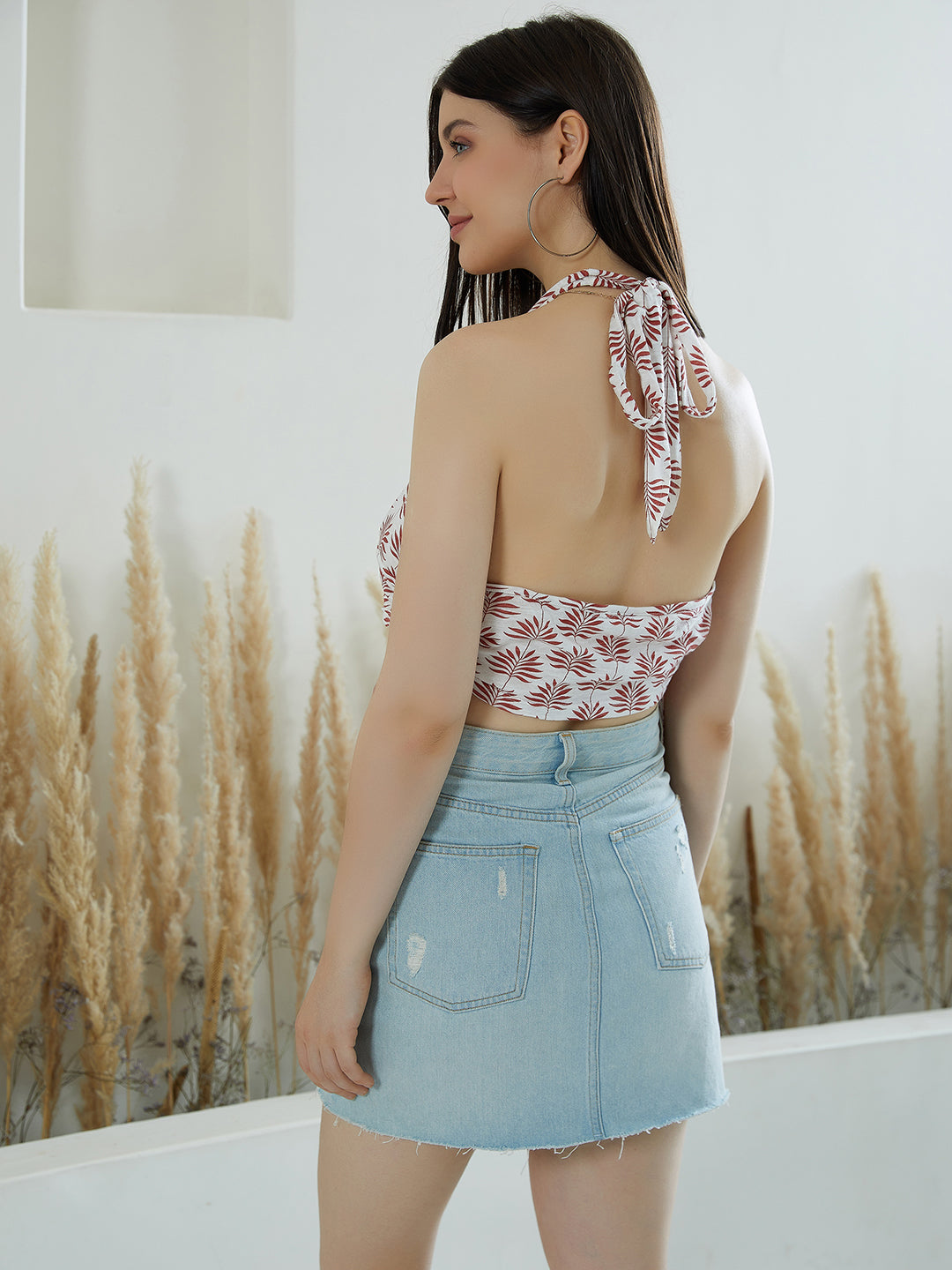 Fulfil your desire for a sleek and slender style statement with an enchanting silhouette by adding to your shopping cart this captivating White Leaf Printed Halter Neck Sleeveless Crop Top from Berrylush. Fashioned with a halter neckline that elegantly accentuated your neck with an adjustable fitting alternative. Presenting sleeveless design that gives your beautiful arms captivating appeal with complete exposure. Also, the tie-up closure assembles a practical design of this top that supports a comfortable fastening attribute. Enjoy with your friends at the beach while looking glamorous by wearing this top with your favourite shorts, golden stud earrings, adorable flip-flops, and a trendy tote bag.