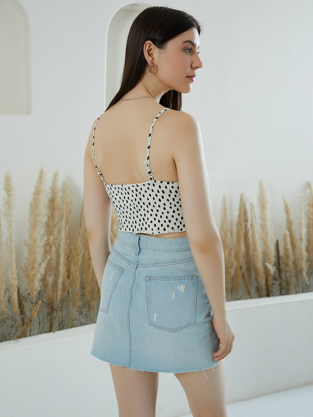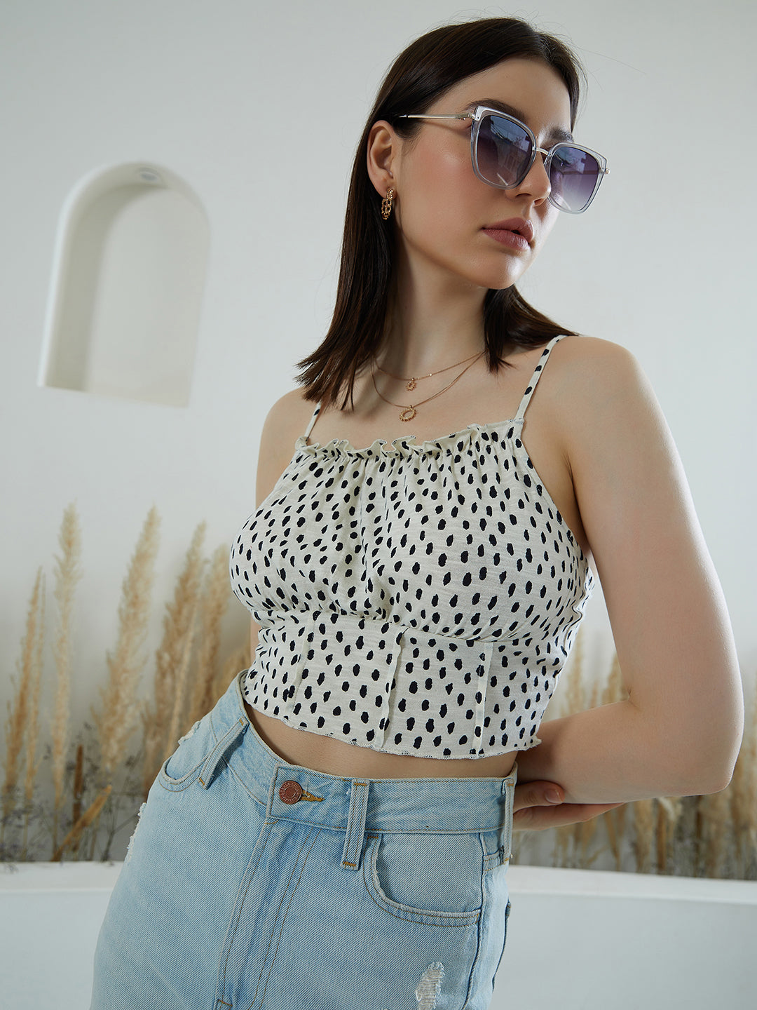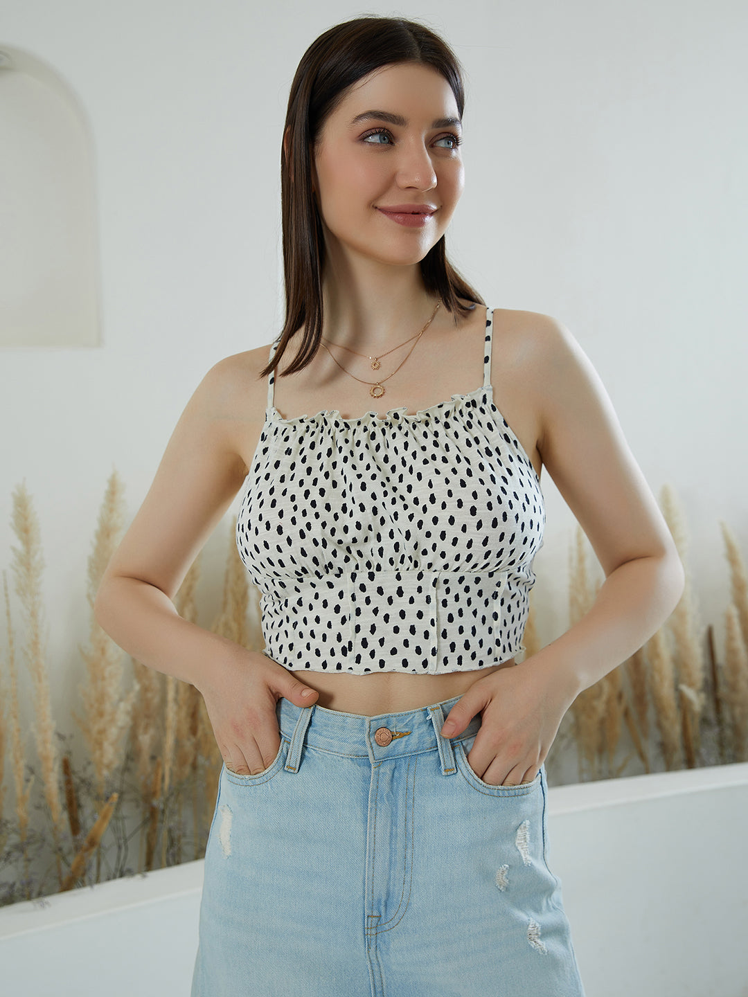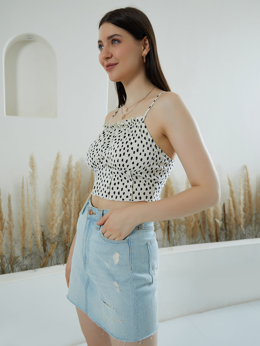 - Crop length creates an illusion of a taller look with an exotic feel