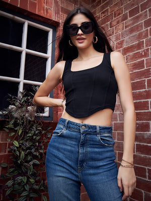 Berrylush Women Solid Black Square Neck Sleeveless Cotton Hanky Hem Cropped Tank Top