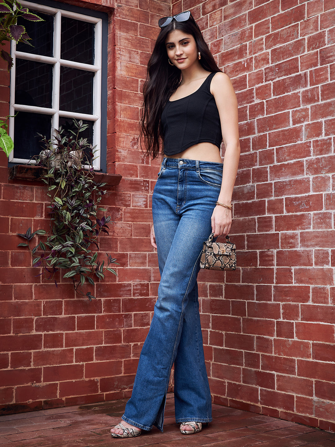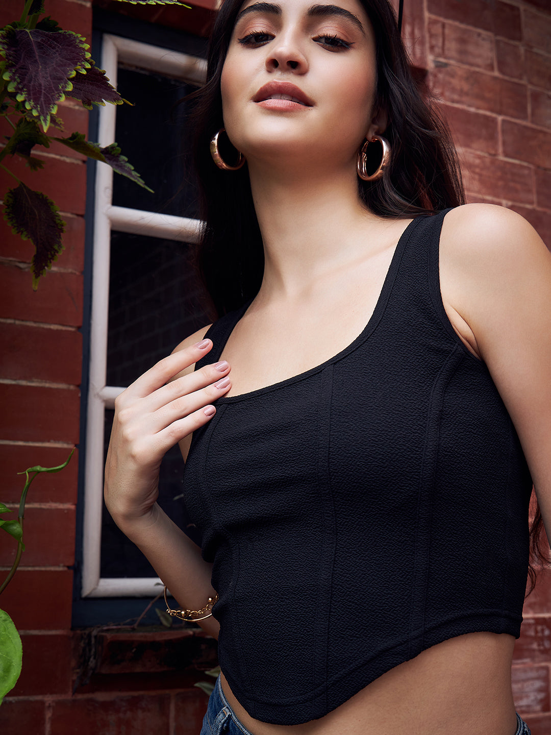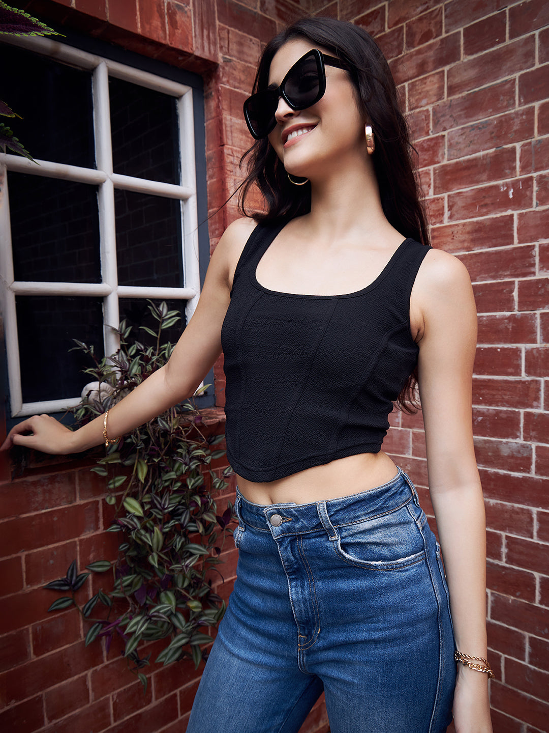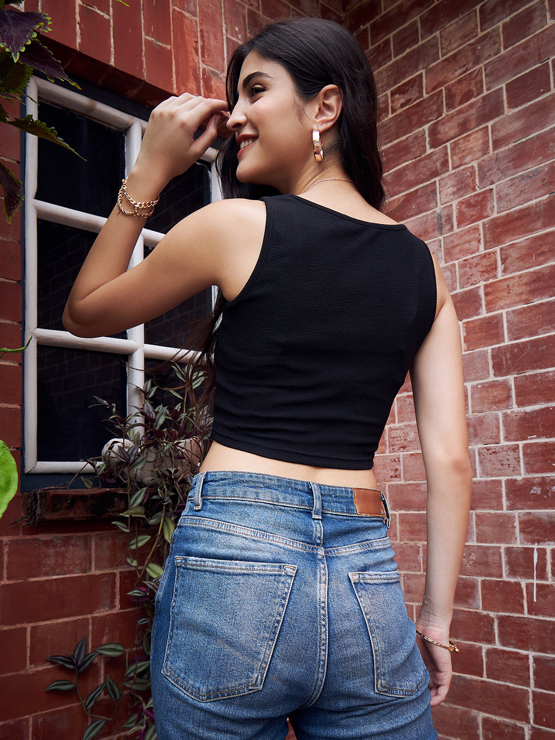 Enjoy yourself in a chilled-out way by opting for summer tunics by wearing this Solid Black Square Neck Sleeveless Cotton Hanky Hem Cropped Tank Top from Berrylush. This top is a must-have for your summer closet as it comes with a sleeveless design that lends your arms an enticing exposure and keeps them cool all day long. Featuring a square design that gives your neckline a dramatic outline that grabs all the attention towards you. Also, the cropped tank design lends you an eccentric appeal which presents your sexy look. Pair this tank top with relaxing fit shorts, crocs, and a waist bag to get an astonishing appearance.