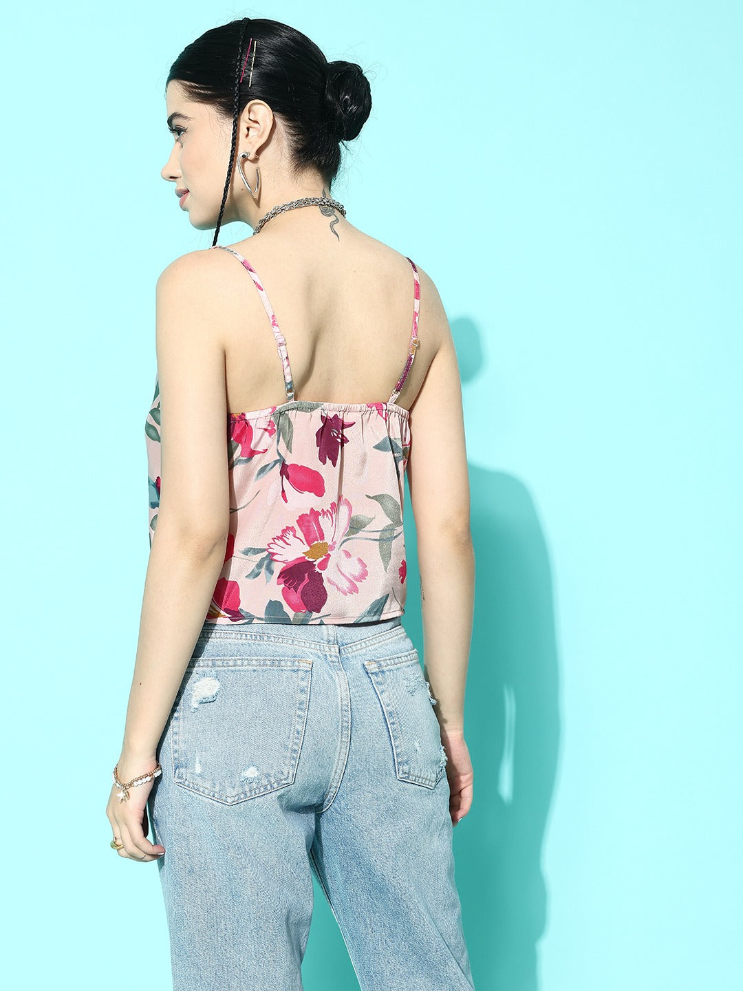 • The pink and green floral print gives this top a chic and feminine look