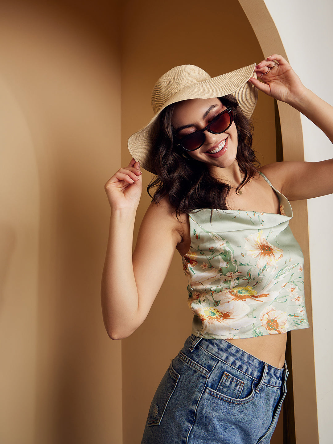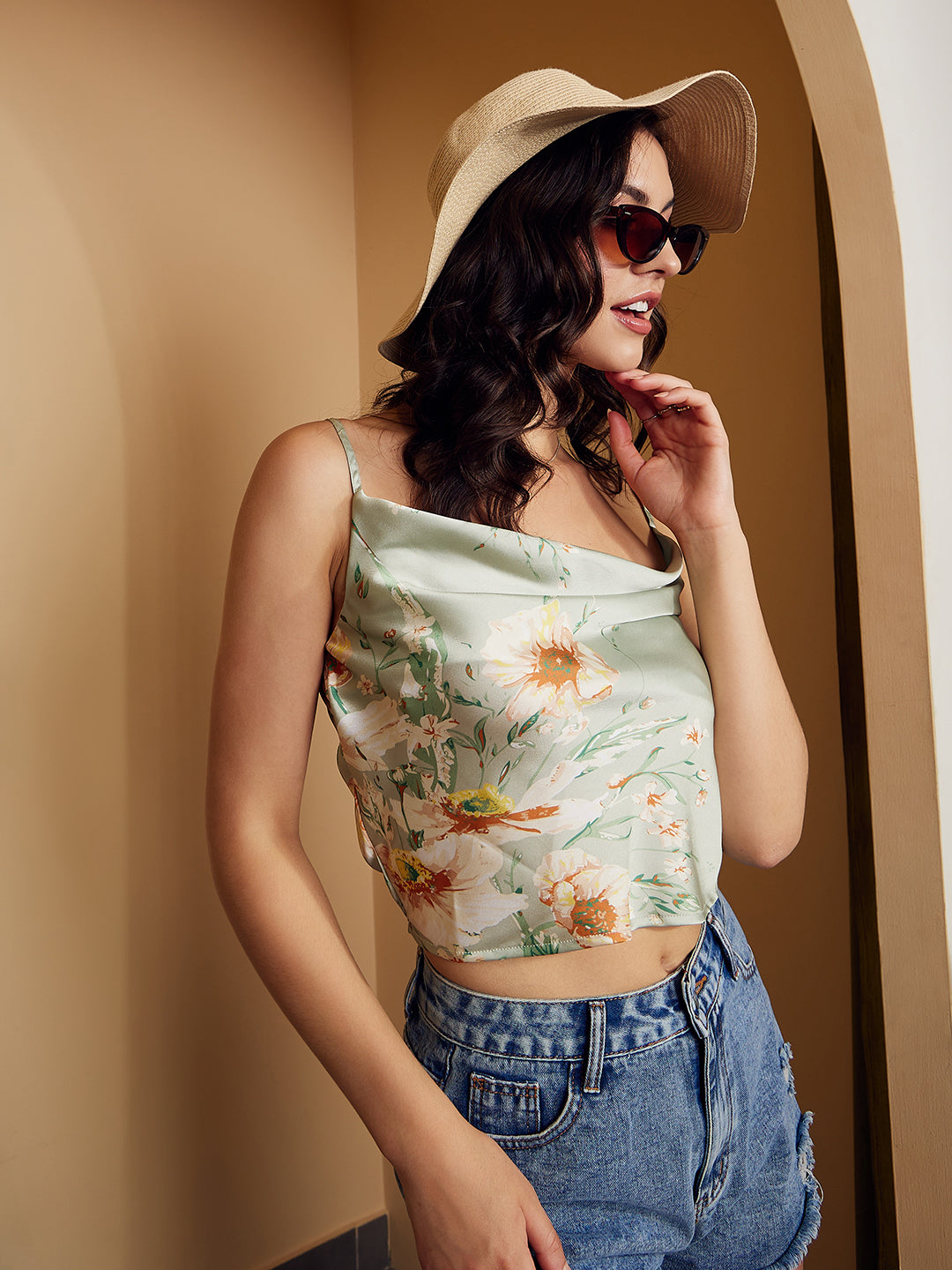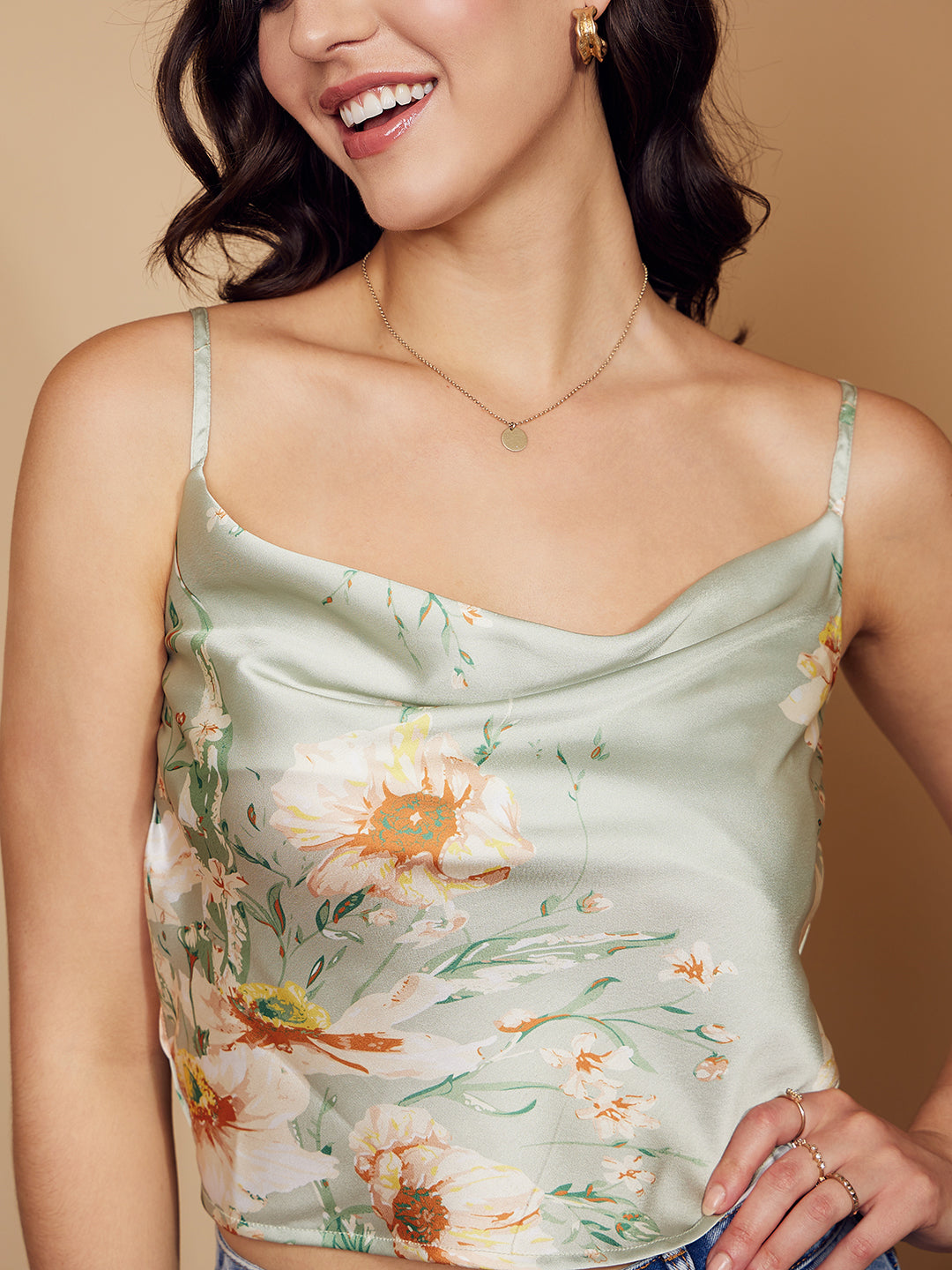 Fortify your outdoor semblance with fun and playful essence by wearing this cute Green & White Floral Printed Cowl Neck Sleeveless Satin Regular Top from Berrylush. Accentuating adorable green and white floral print that makes your casual look appear cheerful with a joyous vibe. Styled with a sleeveless design that gives suitable exposure to your arms along with a decorative look. Moreover, this top comes with a woven weave that keeps your skin free from irritation and provides stunning structural integrity. You can partner up this floral printed top with a high-waist flared skirt, a pair of high-heels, and a side bag to create a fashion-focused look.