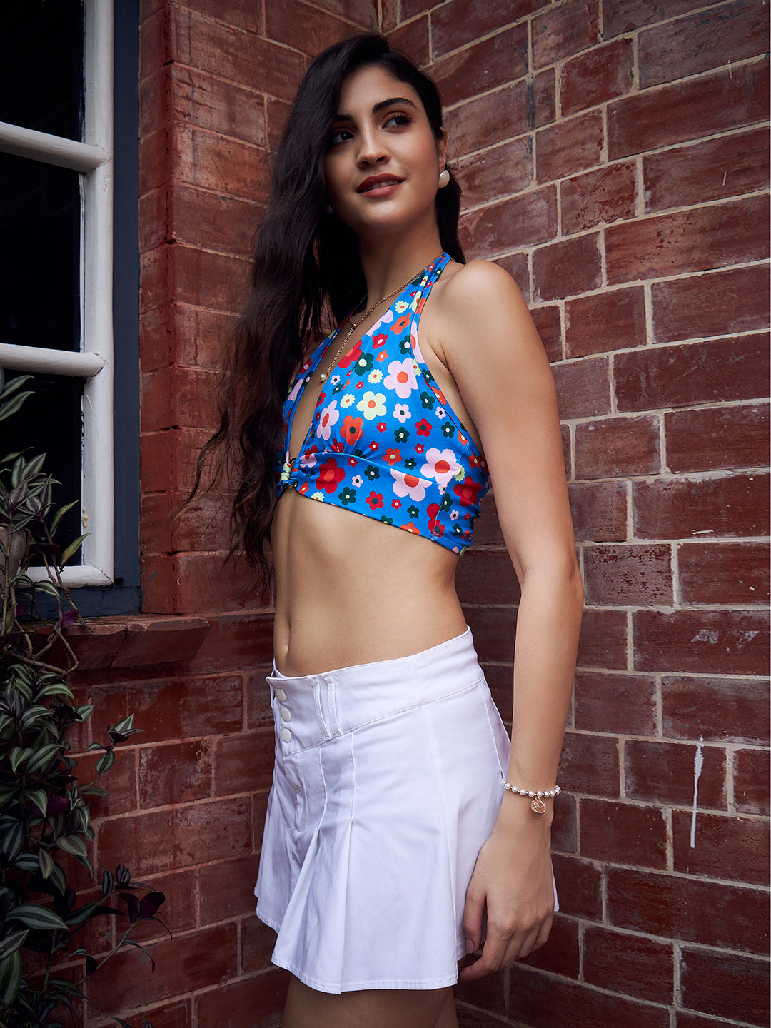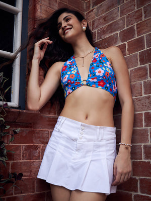 Let your capsule wardrobe exults in the effortless glam and grace of contemporary style with this captivating Blue & Red Floral Printed Halter Neck Tie-Up Open-Back Crepe Cropped Top designed by Berrylush for its latest casual wear collection. Adorned with a charismatic combination of blue and red floral print that gives this top a striking appearance with a bold aura. Tailored in an open-back frame that lends this top curve-hugging silhouette to gracefully showcase your natural curves. The tie-up closure offers this top an easy, quick, and adjustable fastening process with a cute garnishing sheen. Wear this crop top with a mini skirt, a pair of caged heels, silver tassel earrings, and a sassy sling bag to get a stunning look for your weekend plans.