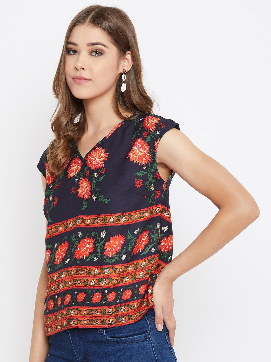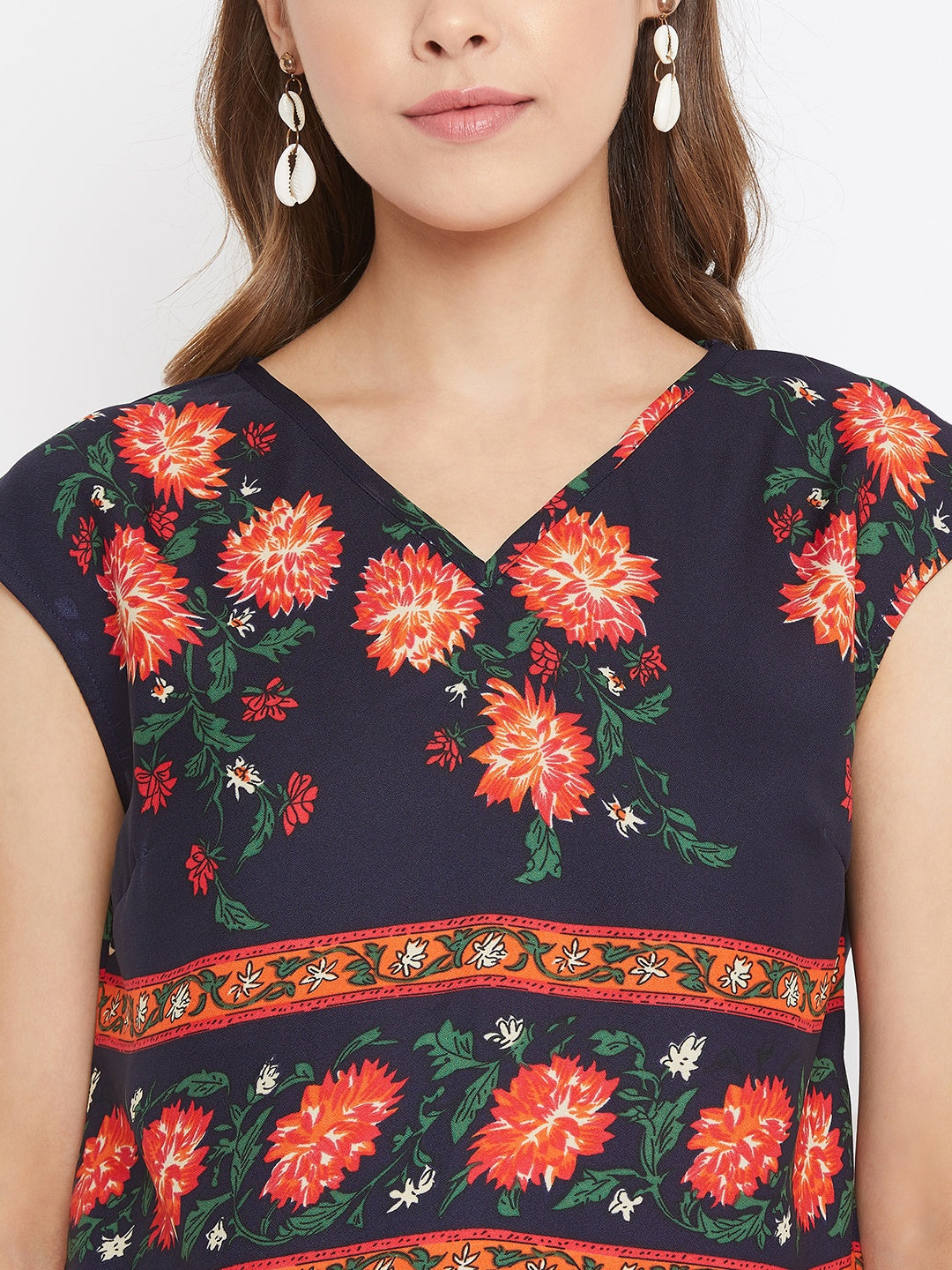 Berrylush Women Navy Blue Floral Print V-Neck Regular Top