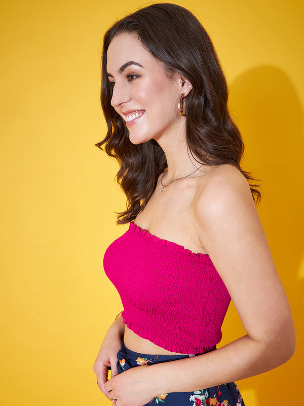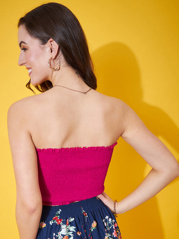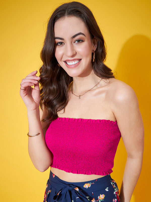 Berrylush Women Solid Bright Pink Strapless Neck Sleeveless Backless Smocked Crop Tube Top