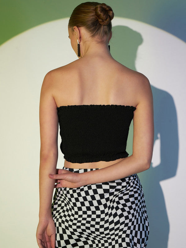 Berrylush Women Solid Black Strapless Neck Sleeveless Backless Smocked Crop Tube Top