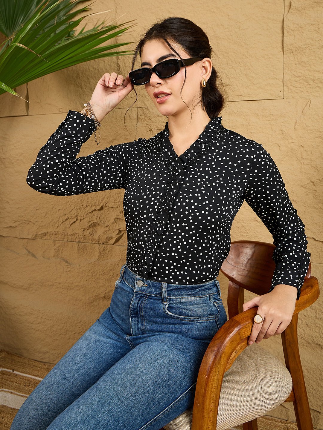 Berrylush Women Black & White Polka Dot Printed V-Neck Long Sleeves Ruffled Regular Top