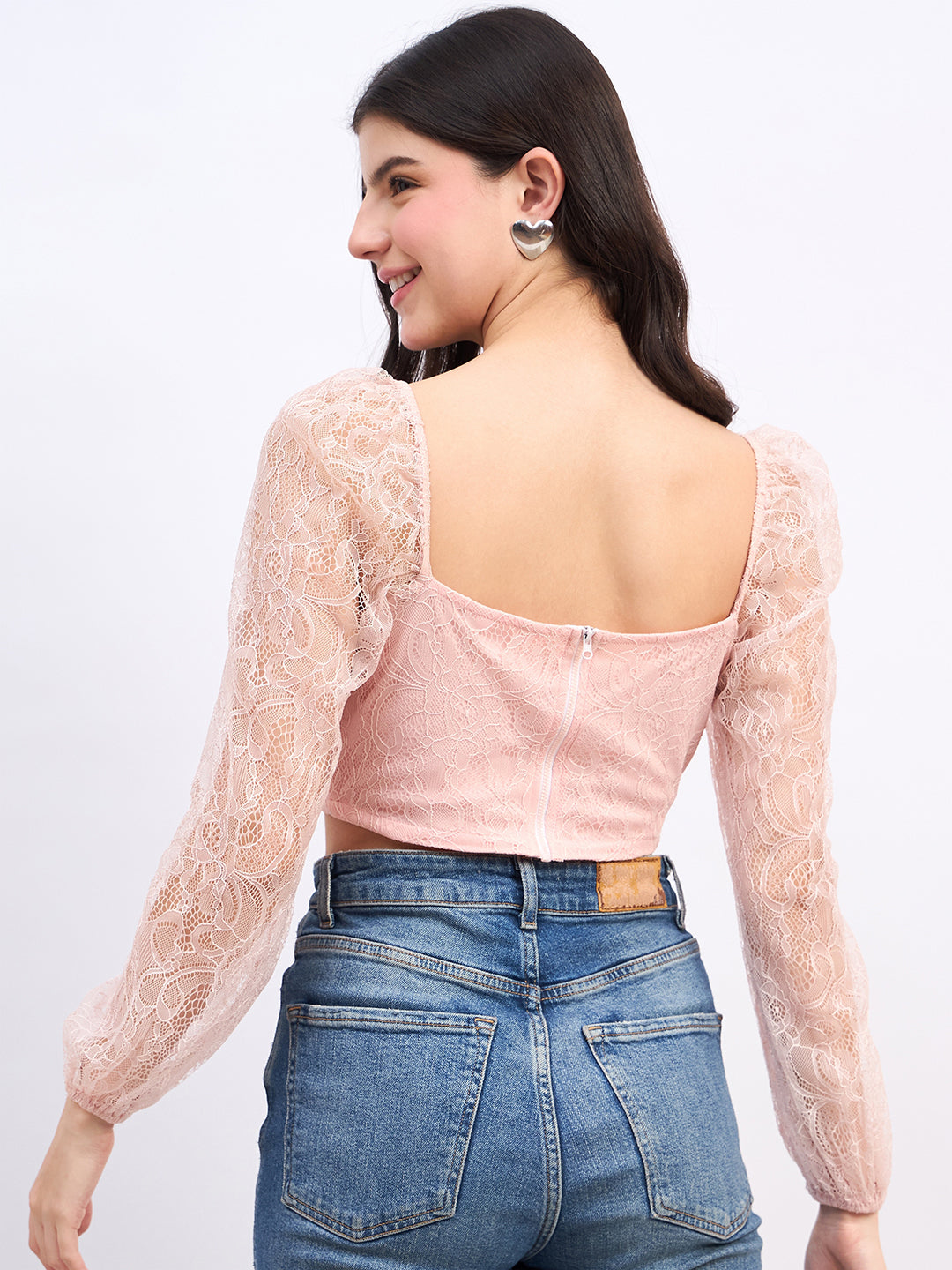 Berrylush Women Solid Pink Sweetheart Neck Puff Sleeves Cotton Back Zipper-Up Lace Knitted Crop Top