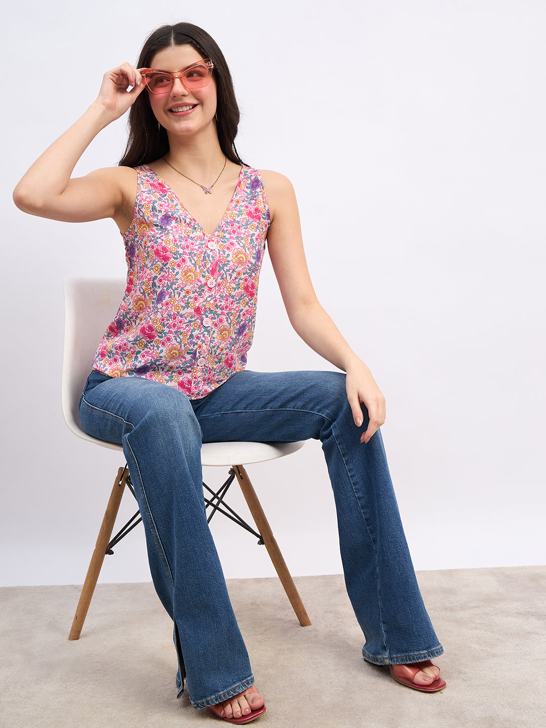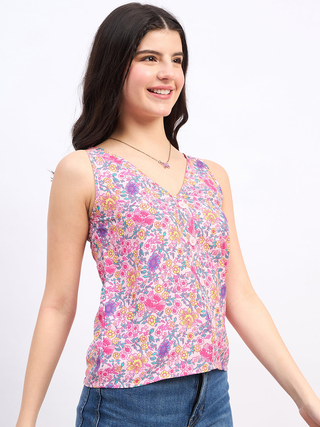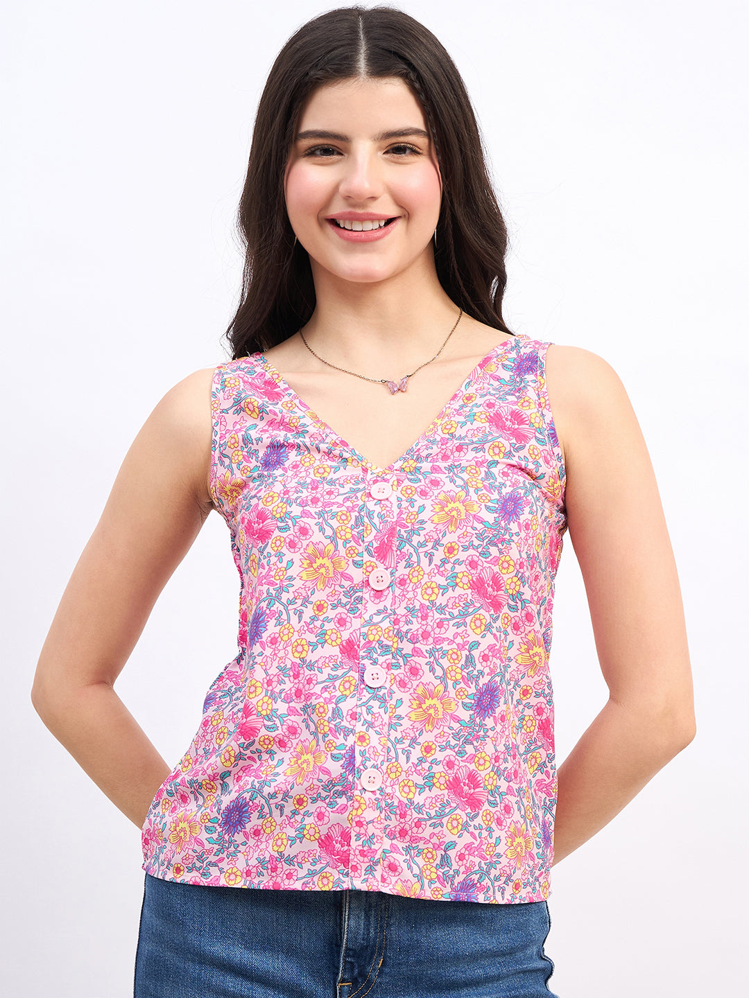 Berrylush Women Pink & Yellow Floral Printed V-Neck Sleeveless V-Back Front Button-Up Regular Top