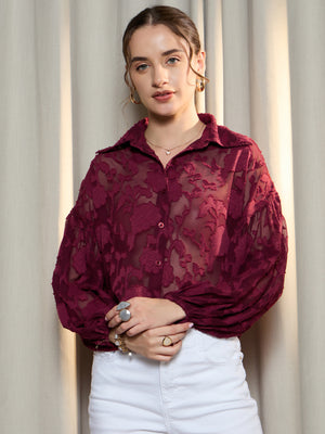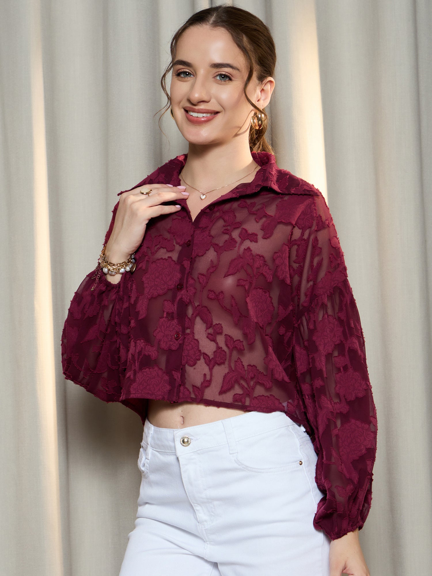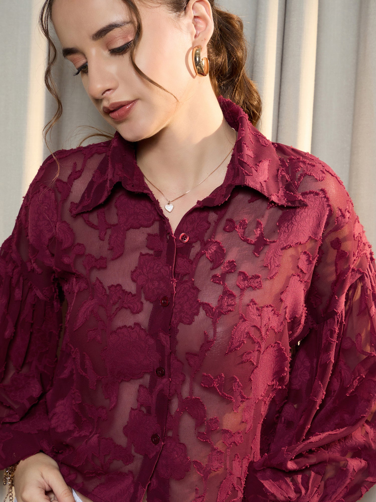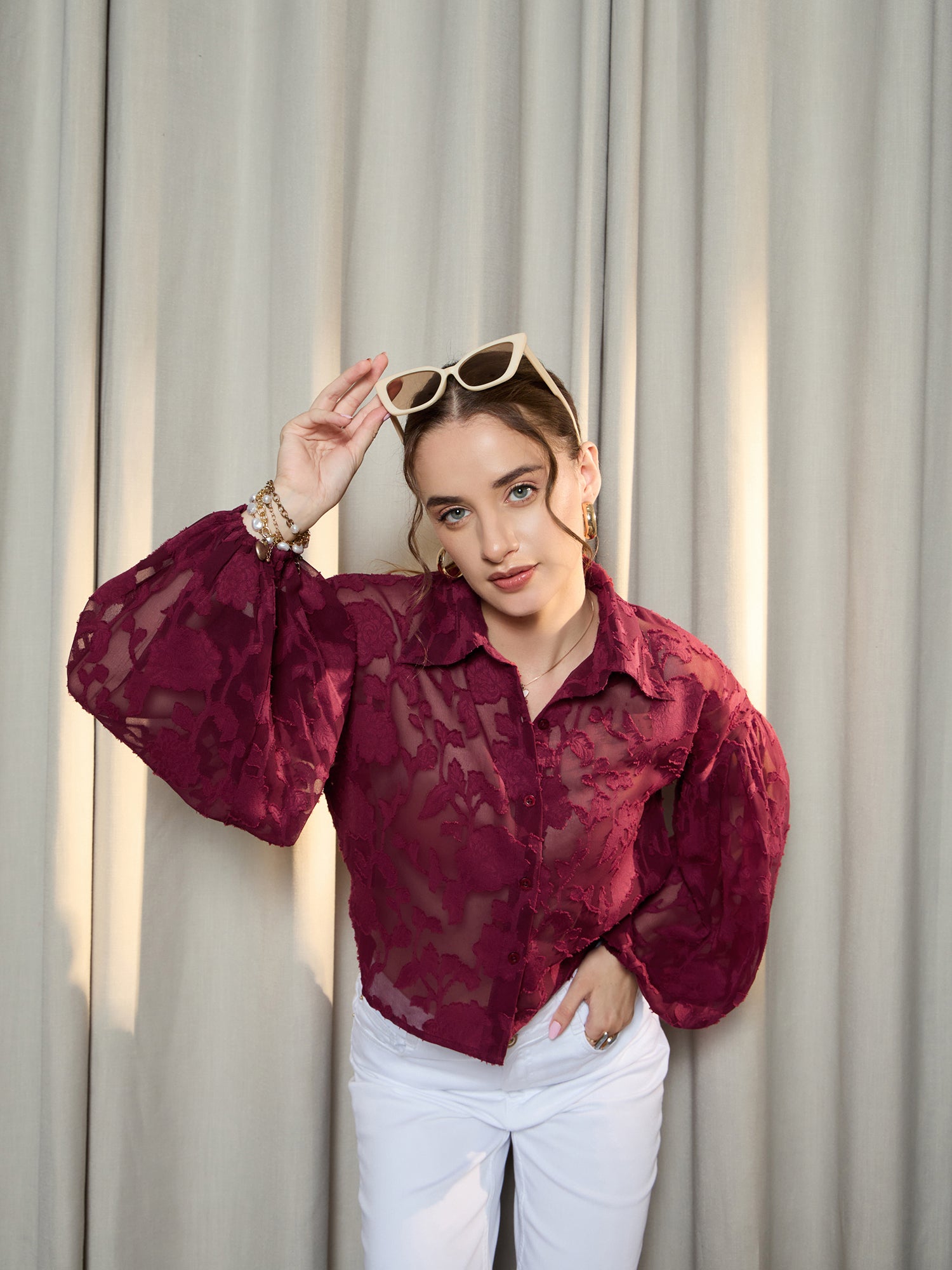 Berrylush Women Maroon Floral Printed Spread Collar Neck Bishop Sleeves Button-Up Regular Top