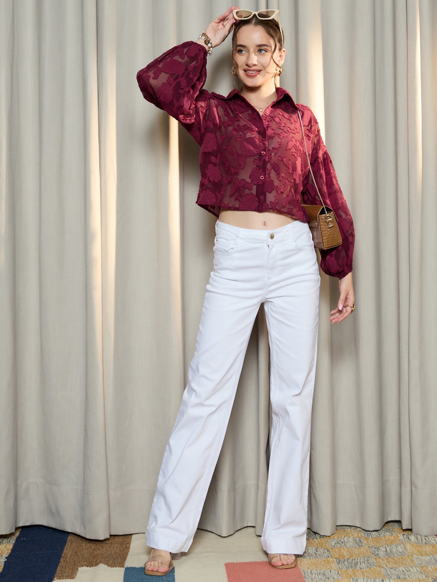 Introducing the Berrylush Maroon Floral Printed Top, your new wardrobe staple for effortless elegance. Crafted from high-quality polyester, this top features a charming spread collar neckline and bishop long sleeves that add a touch of romance to any casual outing. The floral print infuses classic maroon with fresh vibrancy, enhanced by a smart button-up front closure. Designed for comfort and style with an opaque lining ensuring coverage, its regular length allows versatile pairing with jeans or skirts making it perfect for those who value both comfort and chic sophistication in their everyday attire.