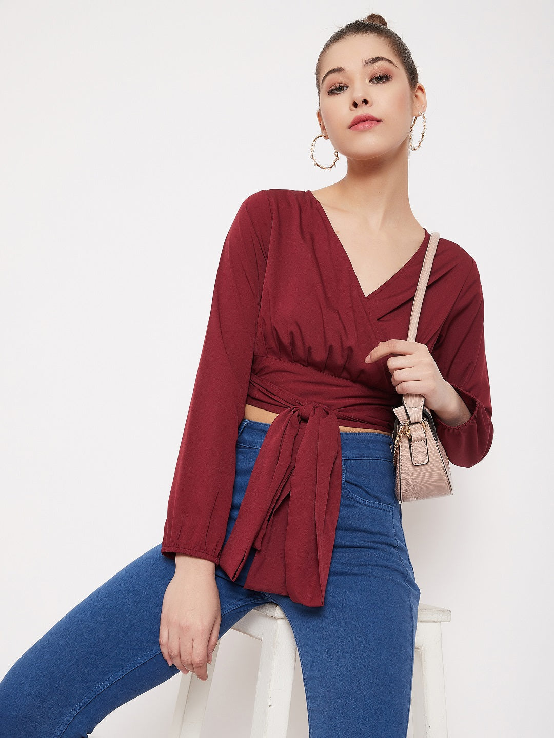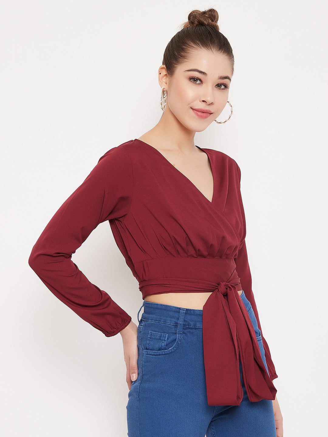 Berrylush Solid Maroon V-Neck Wrap Crop Top appears to be a snazzy piece of style! Break the aesthetic and create new trends daily with fashion staples like this wrap crop top. To expand the feminine aura the designer further included the fabulous attractive long puffed sleeves. The wrap & tie design illuminates a toned torso and a taller layout of your body. The artistic twist of the front knot is simply a gorgeous idea that adds more shine & charm to this outfit. Match this iconic sassy maroon crop top with high-waisted curve-defining jeans and a pair of stilettos. Create a crisp look with this chic outfit exclusively available on Berrylush.
