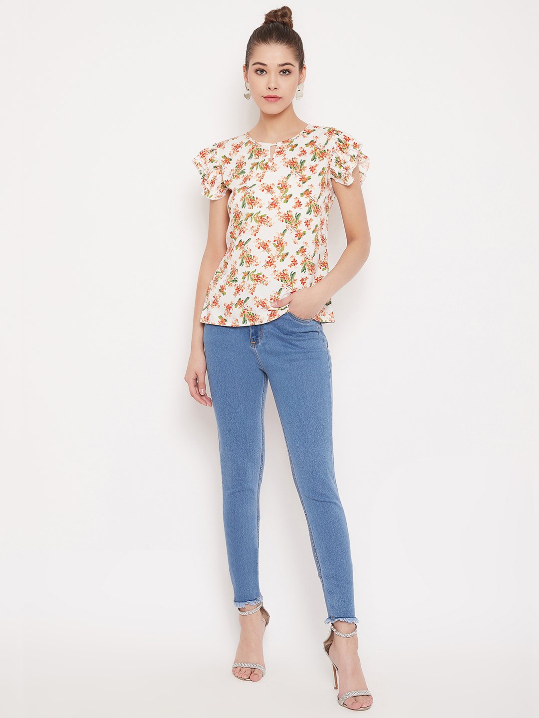 This White Floral Printed Keyhole Neck Ruffle Top from Berrylush is a high fashion regular casual wear top that escalates an ecstatic look to your stylization. Pretty short ruffle armhole sleeves provide a perfect fit to every body type with a confident appearance. Allover floral print with a cute keyhole design at the neck & back makes this top a gorgeous appearance. The round shape of the neckline feels comfortable around your neck and contributes to creating an amazing appeal. Style this white-coloured top with skinny fit jeans and matching low-top sneakers for a fashionable look. Try this cute regular top from Berrylush and spread flowery essence wherever you go.