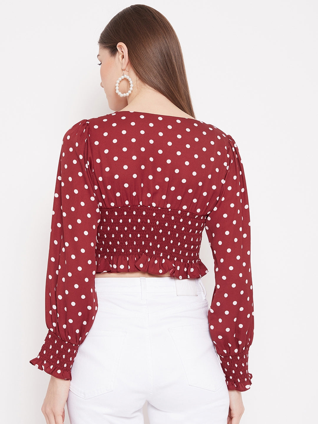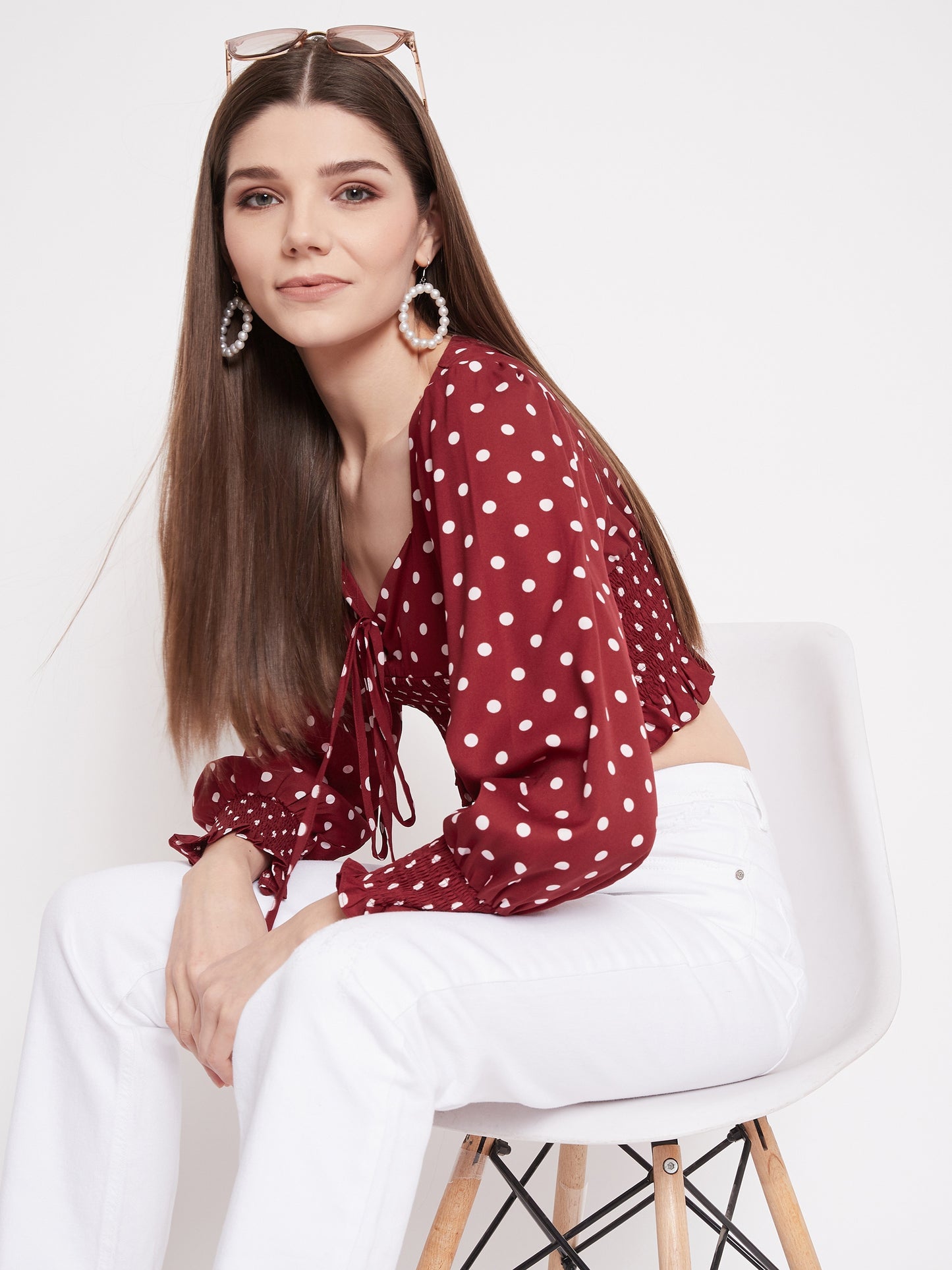 The Berrylush Red Polka-Dot Front Tie Shirred Crop Top is a fun and flirty top perfect for any occasion! This gorgeous crop top features V-neckline, a fitted bodice, and a pleated hem for creating a charming look. All-over white polka dot print gives a touch of style to this red-colored top. Designed with bishop-styled sleeves and cropped length that adds an attractive edge to this top. It also has a stylish tie-knot detailing that complements its overall charming look. Dress it up with a pair of skinny jeans and a cute pair of loafers for a fashionable appearance.