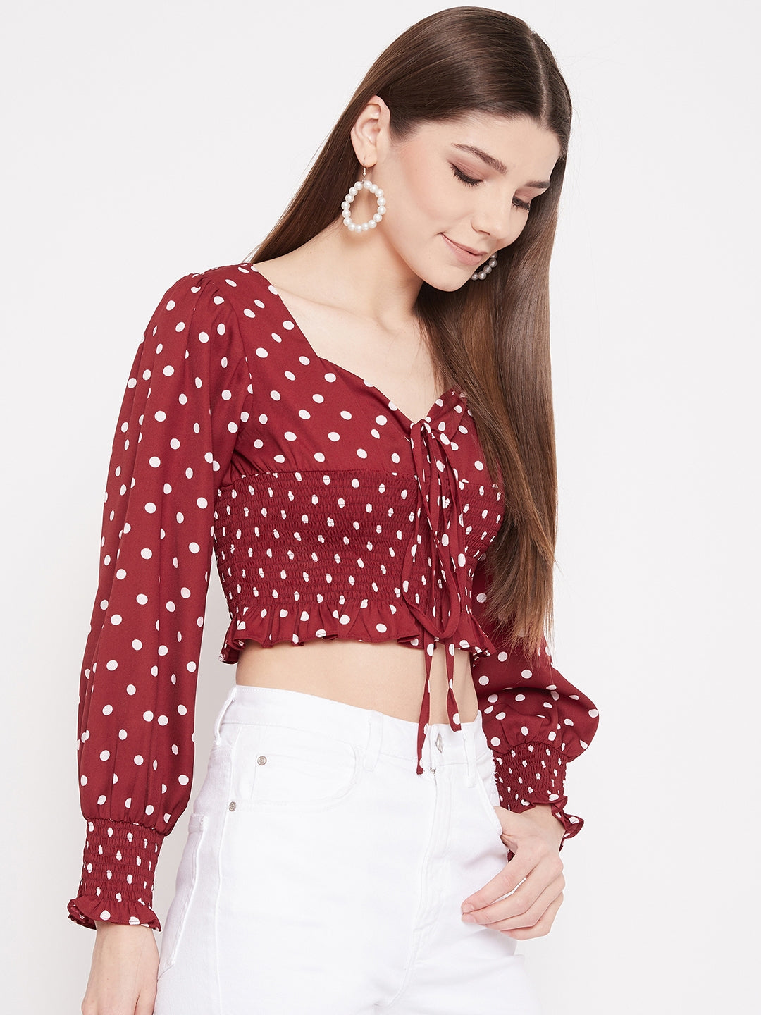 Berrylush Women Red Polka-Dot Print Front Tie Shirred Crop Top