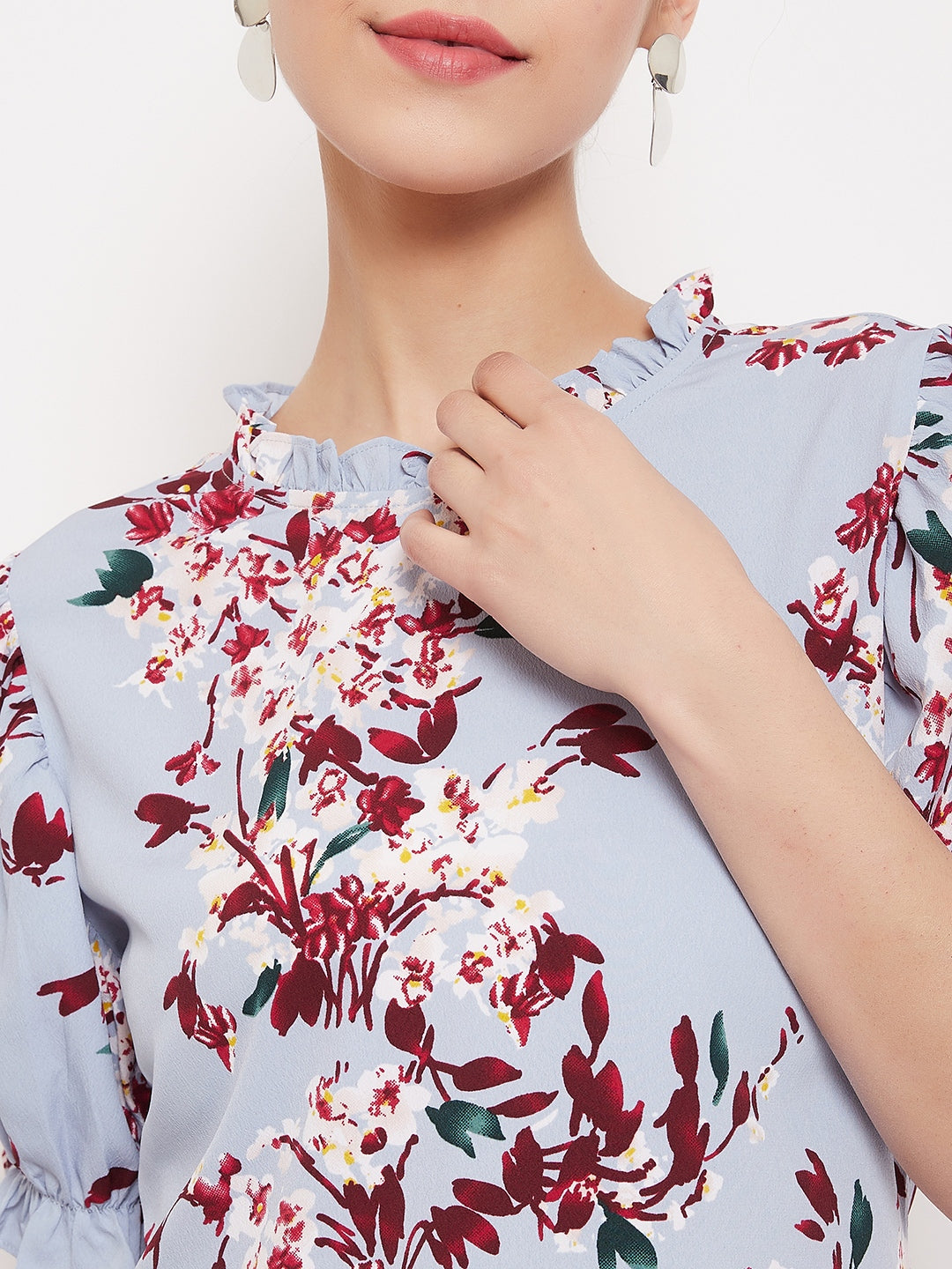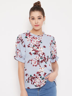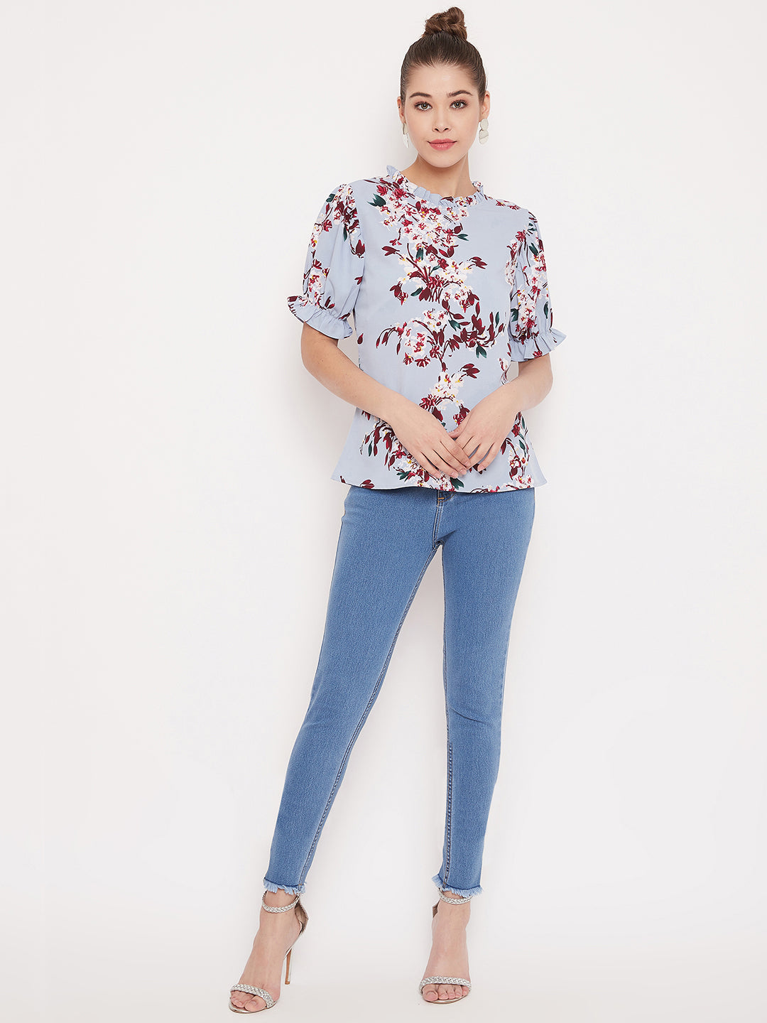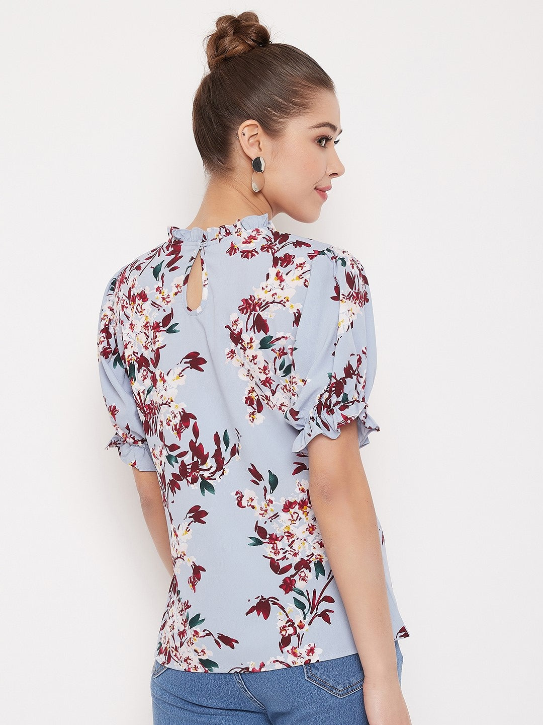 Berrylush Women Blue Floral Printed Round High Neck Top