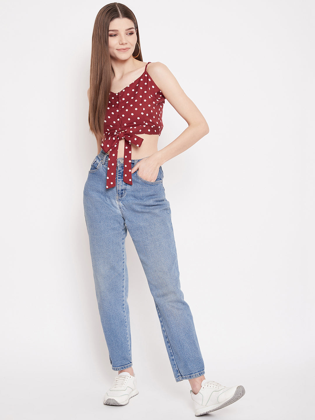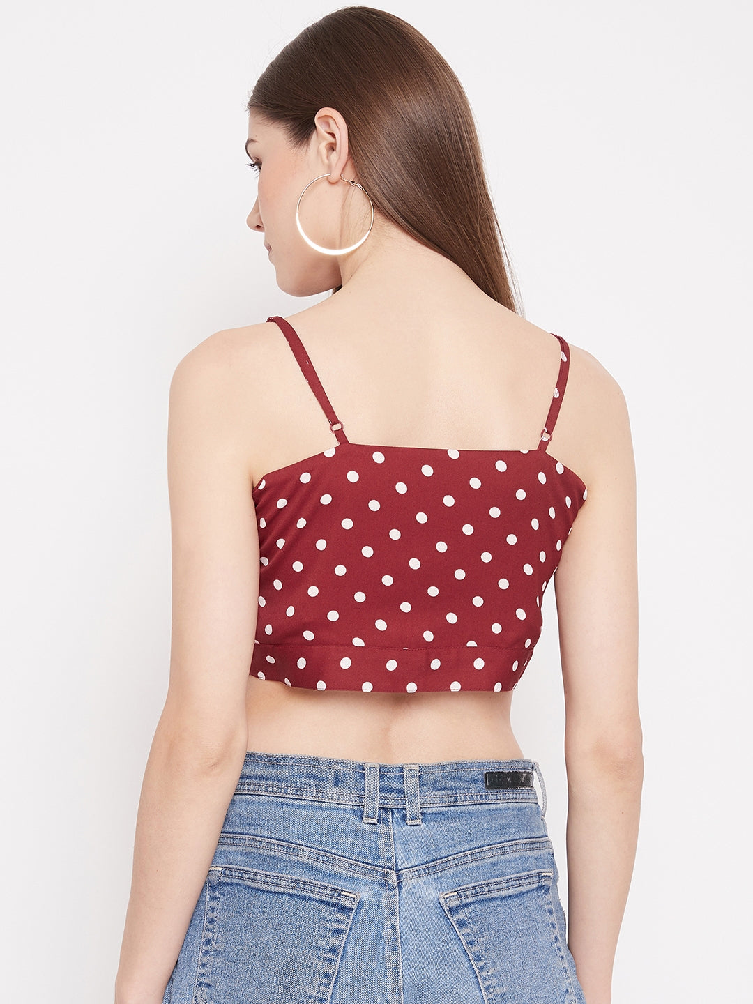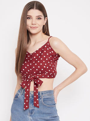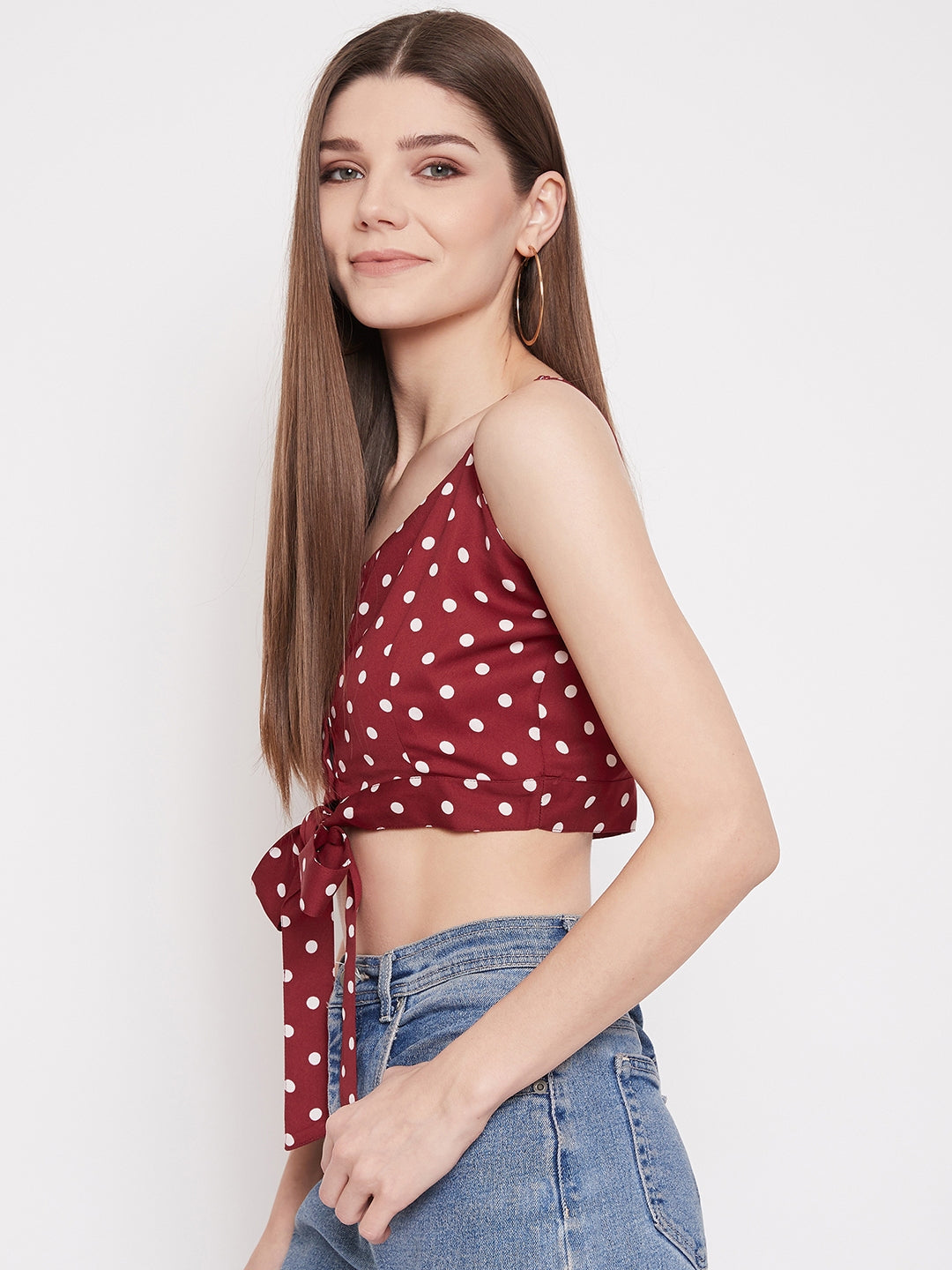 Berrylush Red Polka Dot Printed Crop Top is perfect for a love-filled evening with your special one. The red color of this knotted crop top produces a romantic & charming statement to your look. A petite top with a girly decorative layout is the best way to flaunt a woman's beauty. Moreover, the exotic tailored hemlines and creative polka dot print entice lovely chemistry between your moves and overall look. With the spaghetti strap presence, the v-shaped neckline further gets a clean and sensual look. For a blissful romantic makeover, you need to accessorize this outfit with silver sandals and slim-fit high-waisted jeans. Buy this Berrylush chic red polka dot crop top and add up a cool mood to your special evenings.